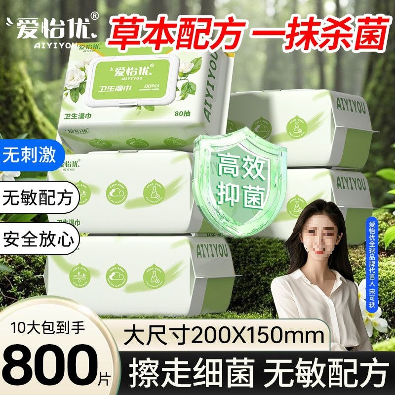 爱怡优杀菌湿巾80抽卫生湿纸巾大包家用99.9%杀菌温和不