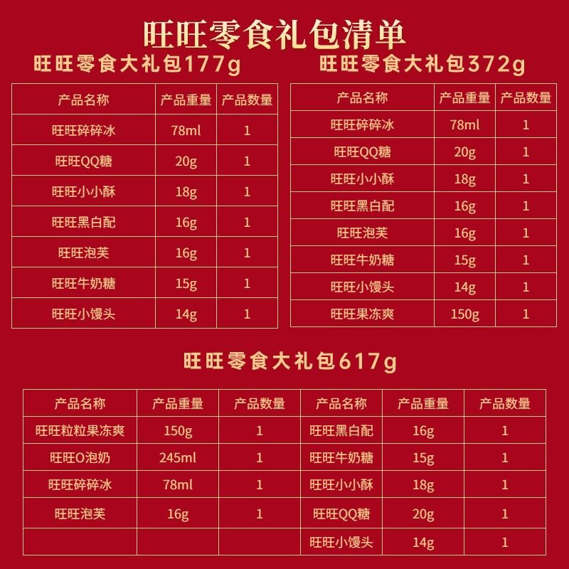 包装规格 | 【一定暴富小号礼包】617g旺旺零食 | | 包装规格 | 【旺一旺小号礼包】617g旺旺零食 |