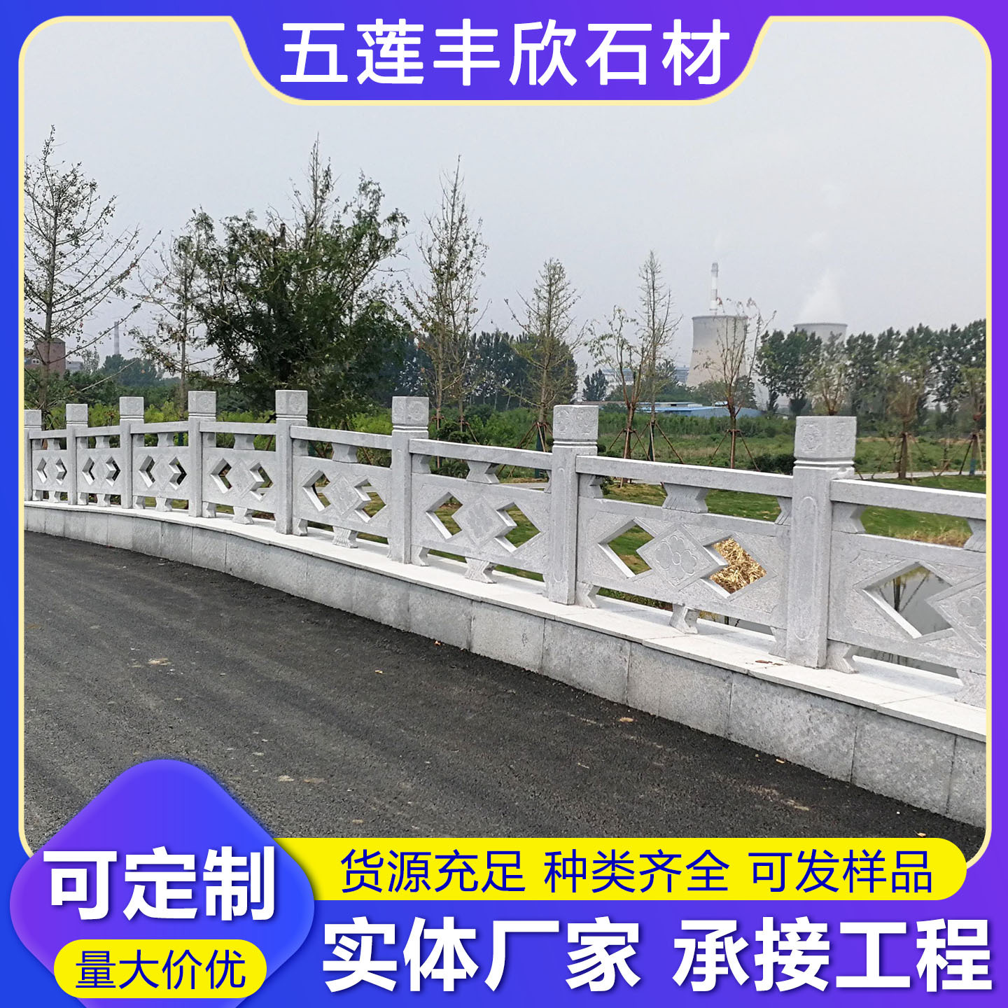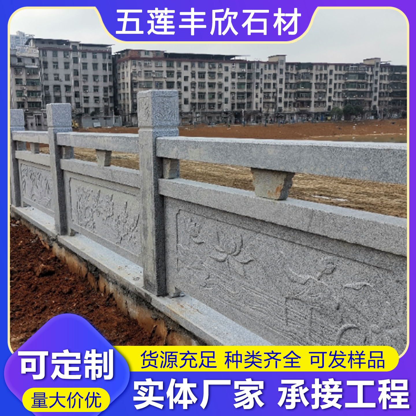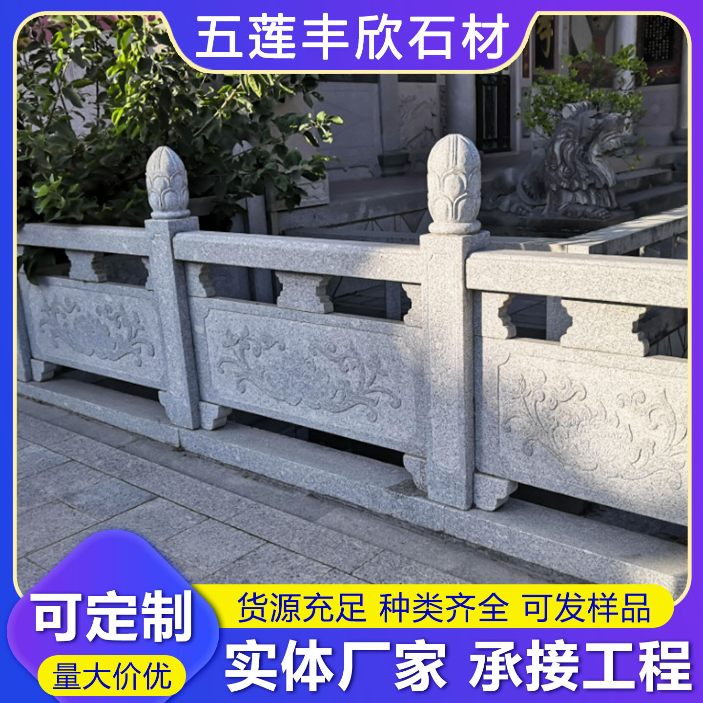 花岗岩芝麻灰五莲花石雕栏杆 寺庙大理石浮雕栏板 河道庭院栏杆板