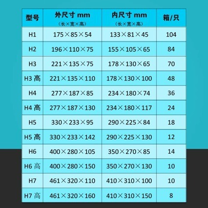 | 最小包装数 | 104 | 规格 | H1有字有孔 内尺寸133*81*45 |
