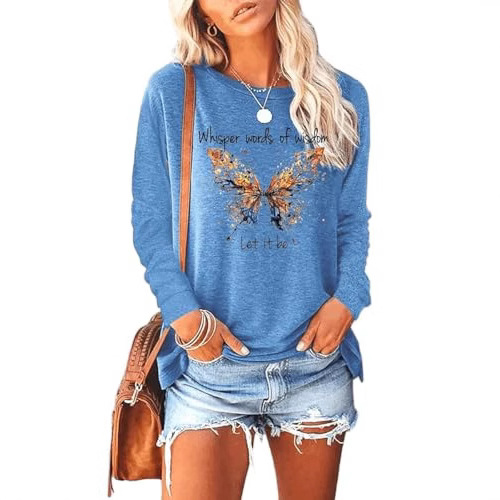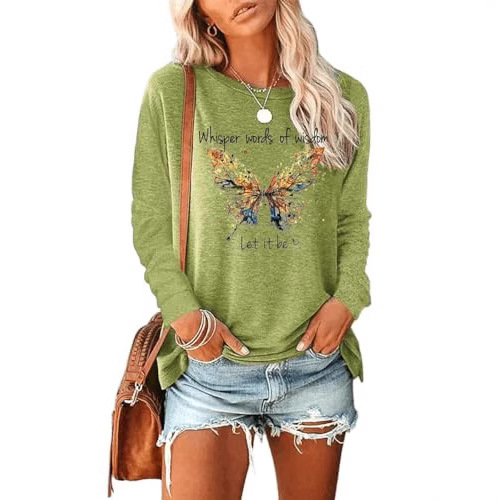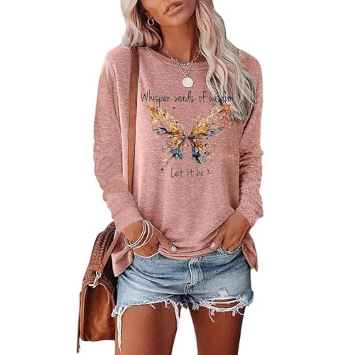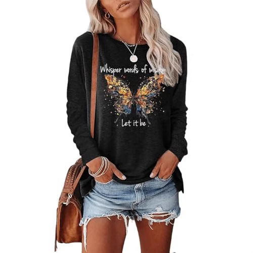 欧美新款宽松型套头春秋女装 蝴蝶字母印花女士都市休闲圆领长袖T