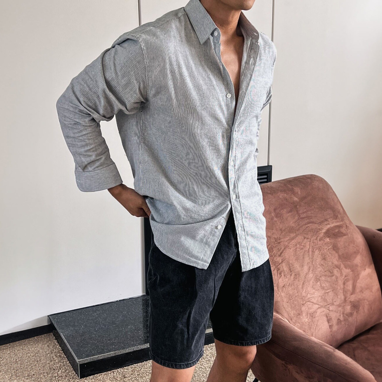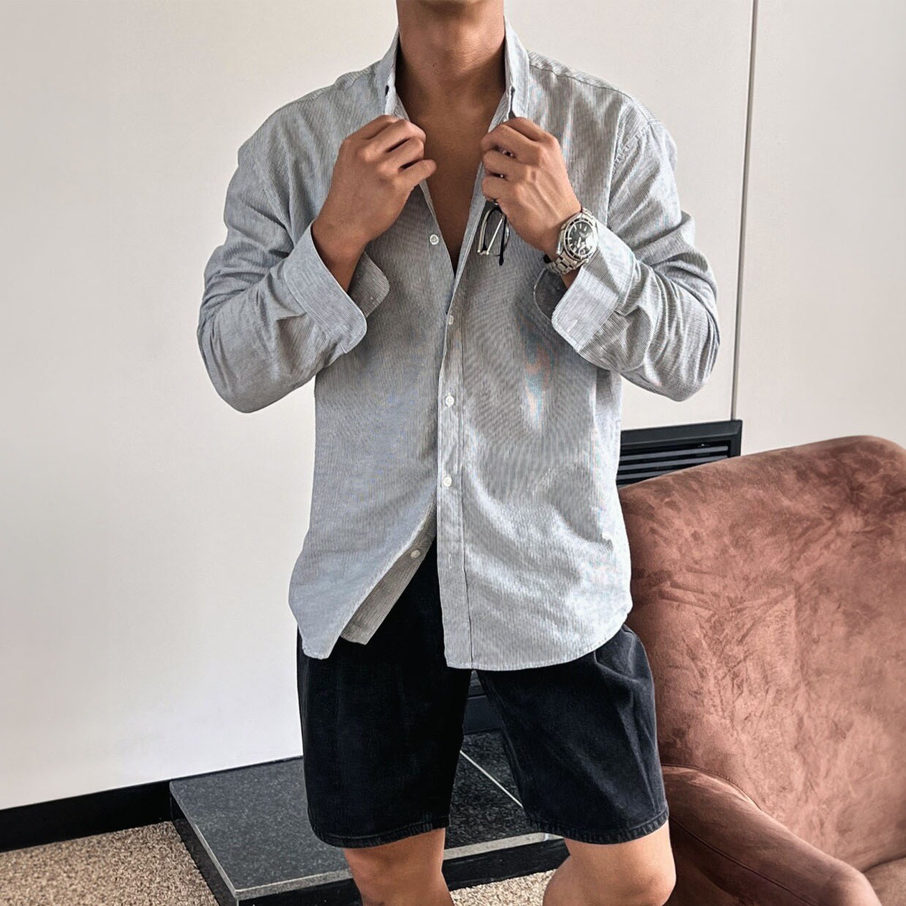 浅灰色翻领衬衫男士复古英伦风雅痞长袖衬衣简约百搭上衣外套
