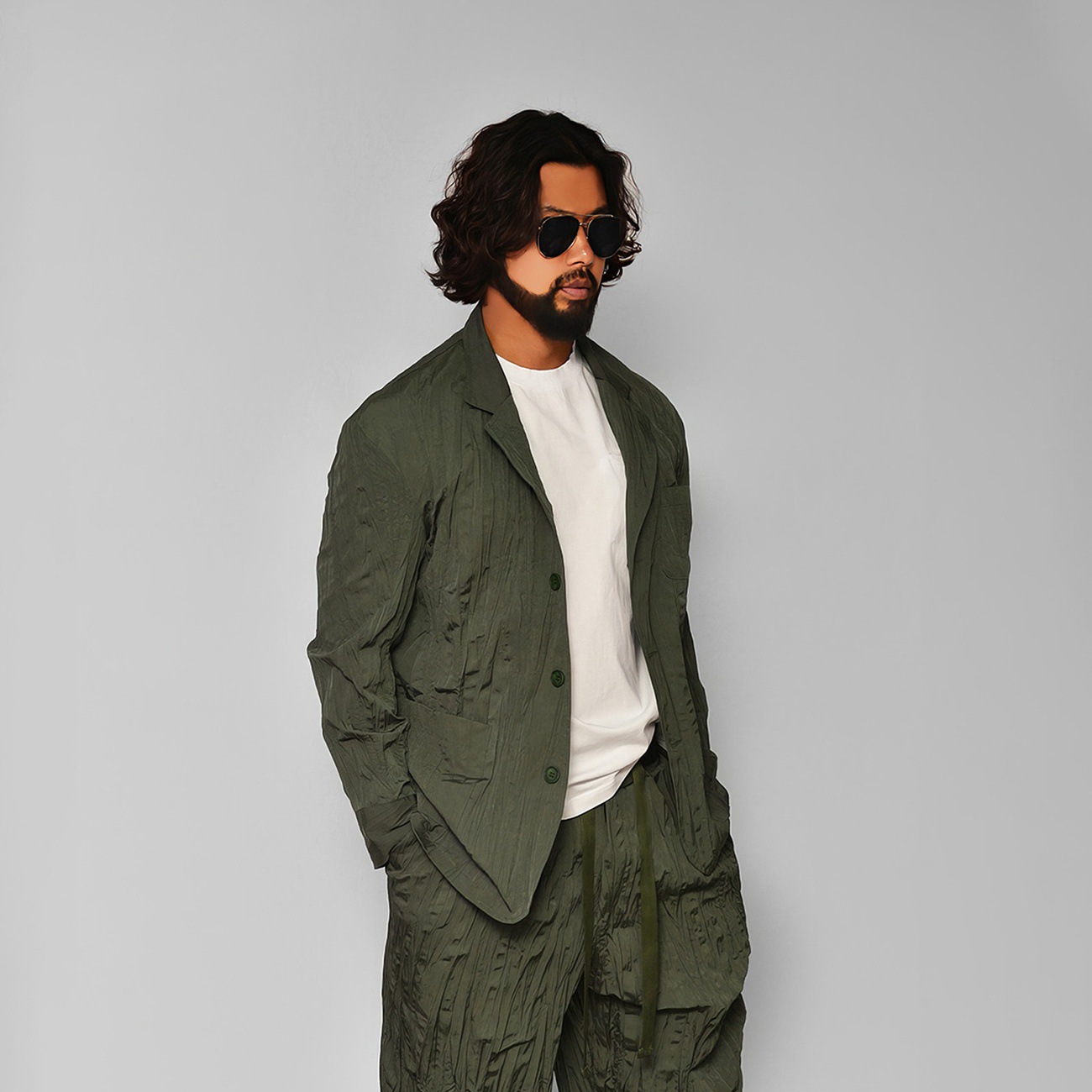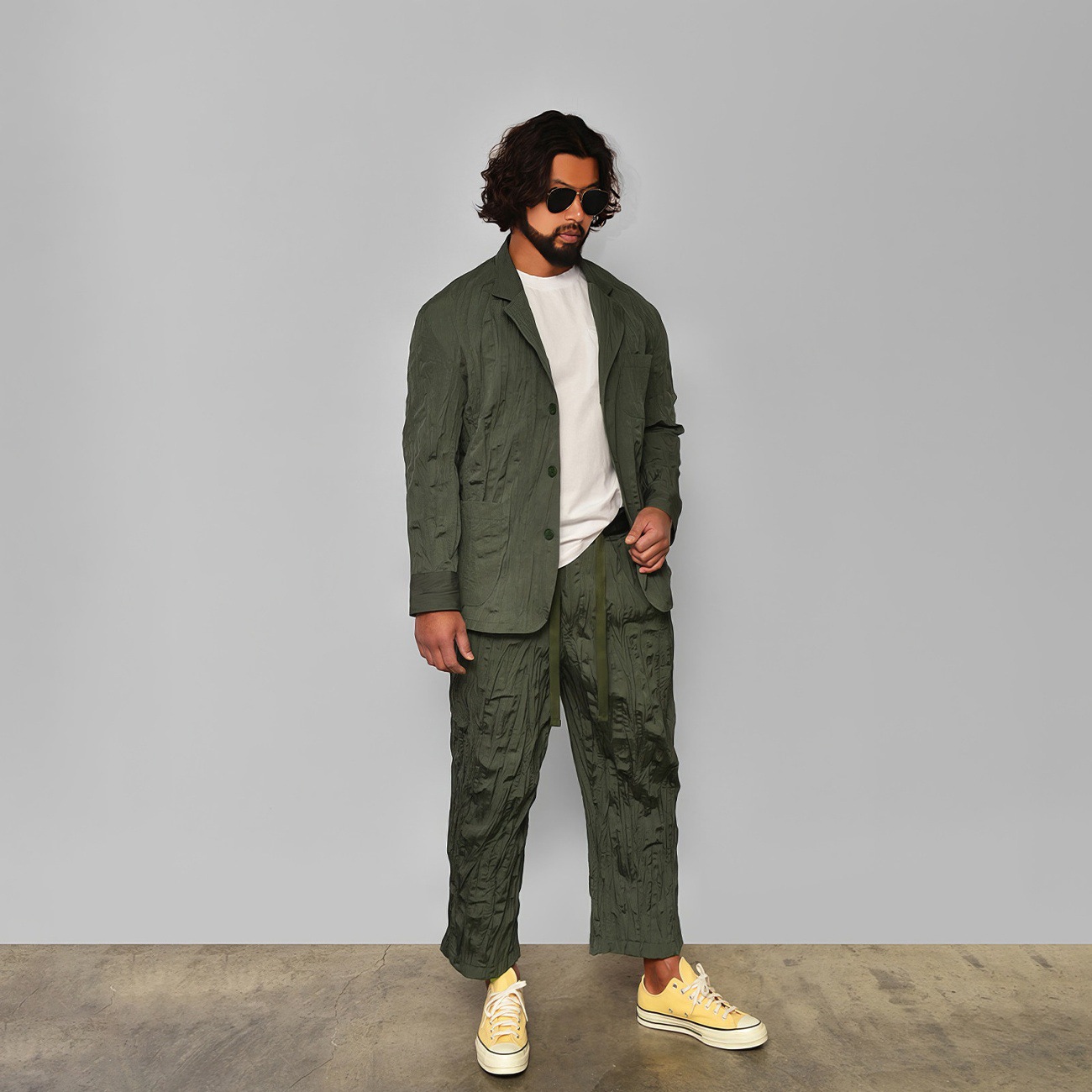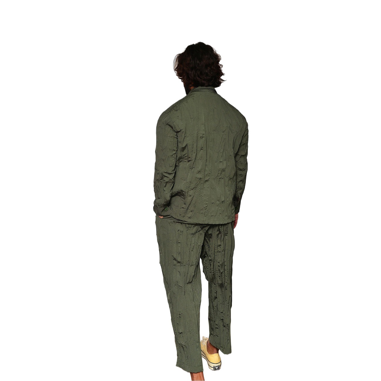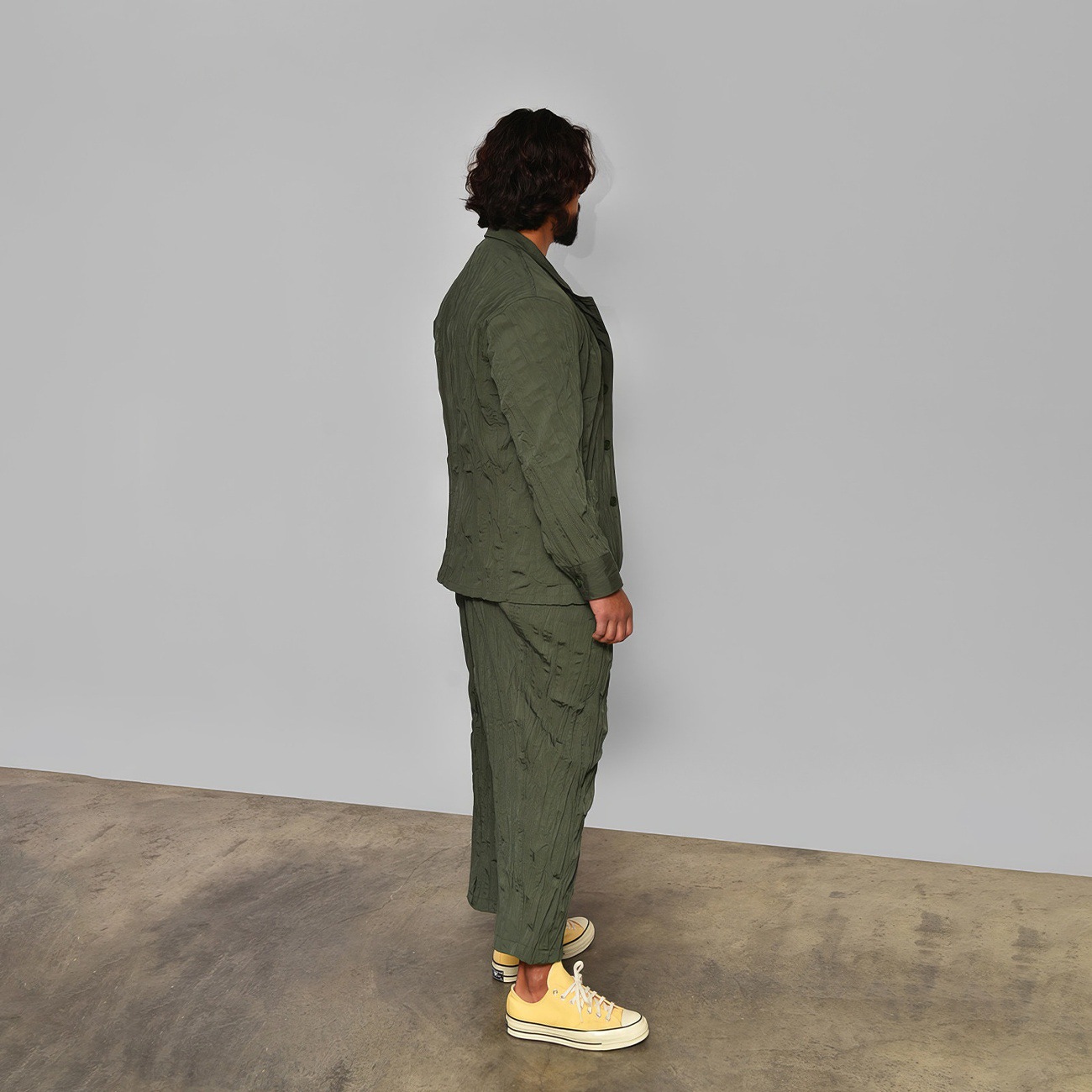 军绿色百褶长袖衬衫套装男春秋新款成熟稳重免烫宽松直筒休闲西裤