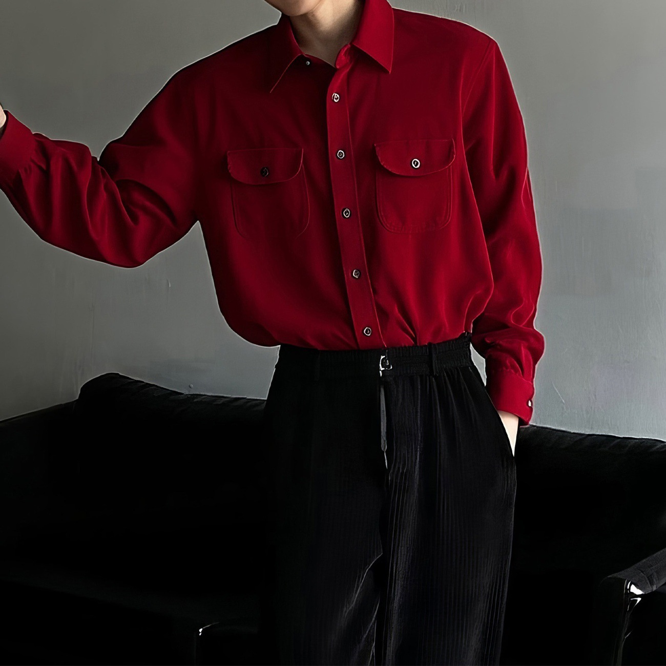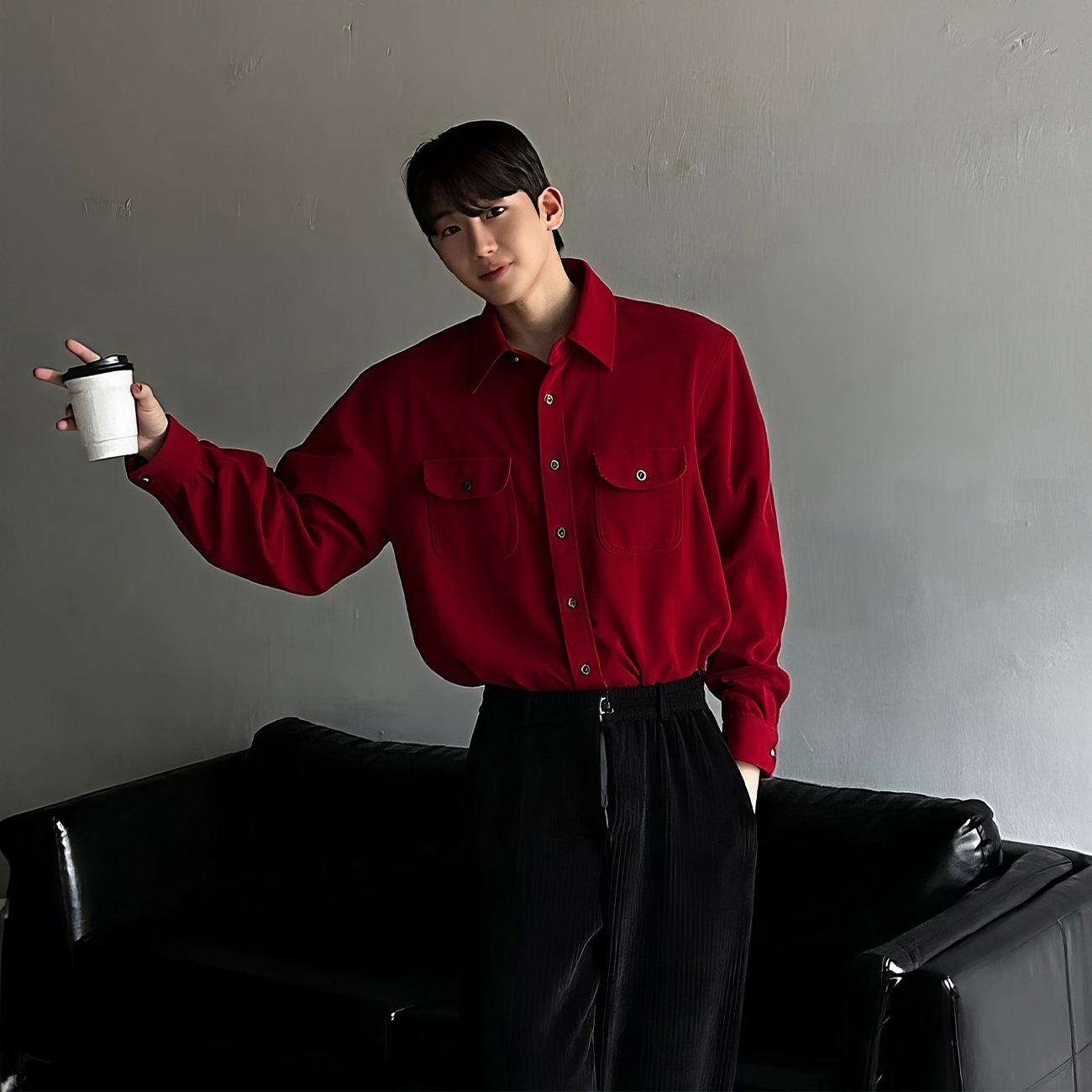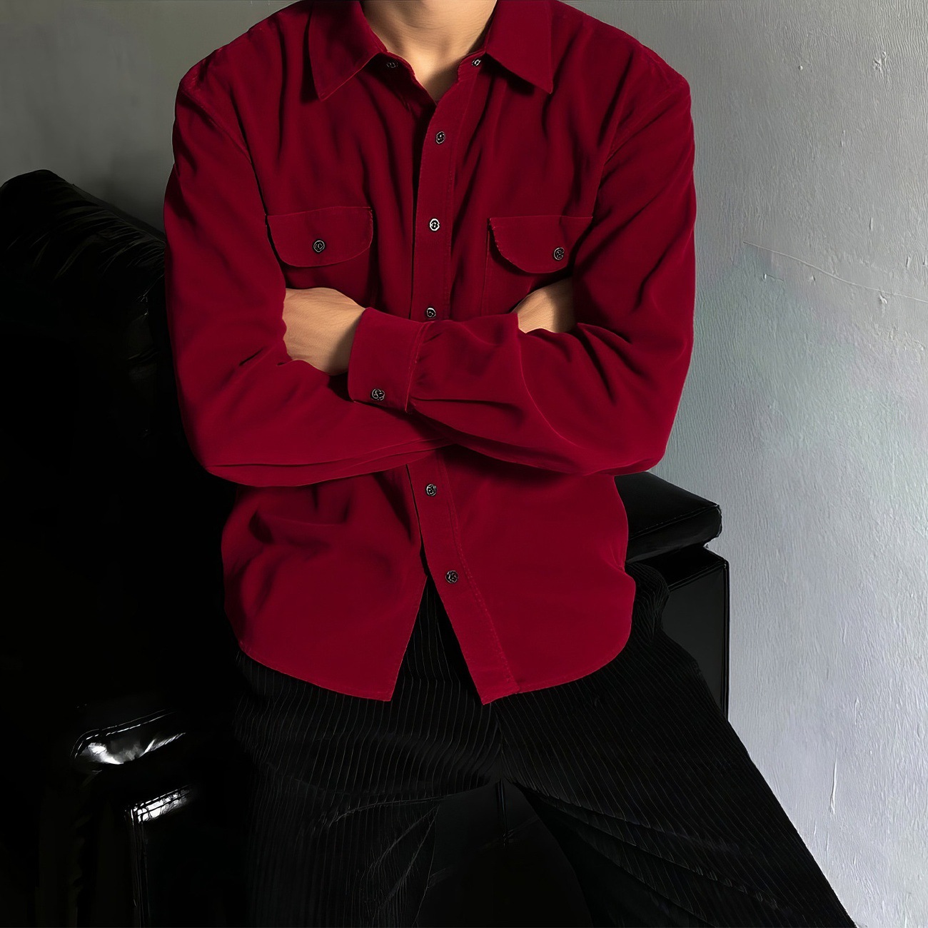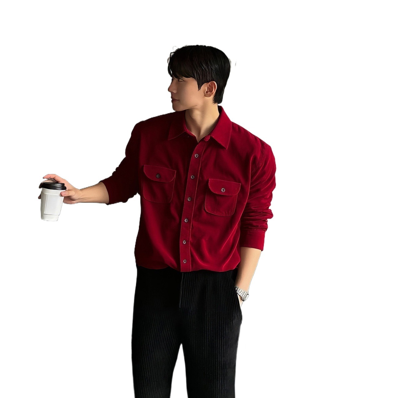 红色翻领长袖灯芯绒衬衫男士春秋季本命年喜庆结婚叠穿衬衣外套男
