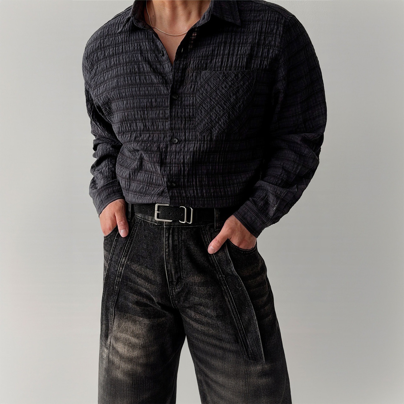 深灰色美式复古格子长袖衬衫男款春秋季潮流肌理感老钱风免烫衬衣