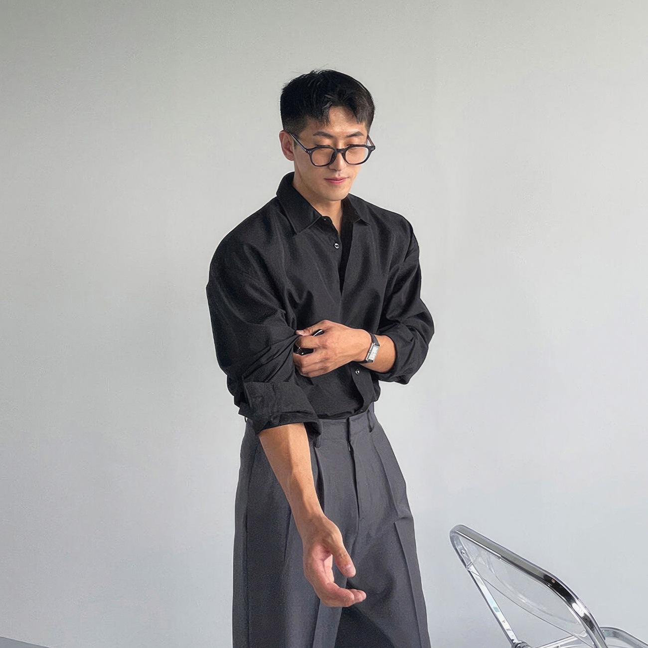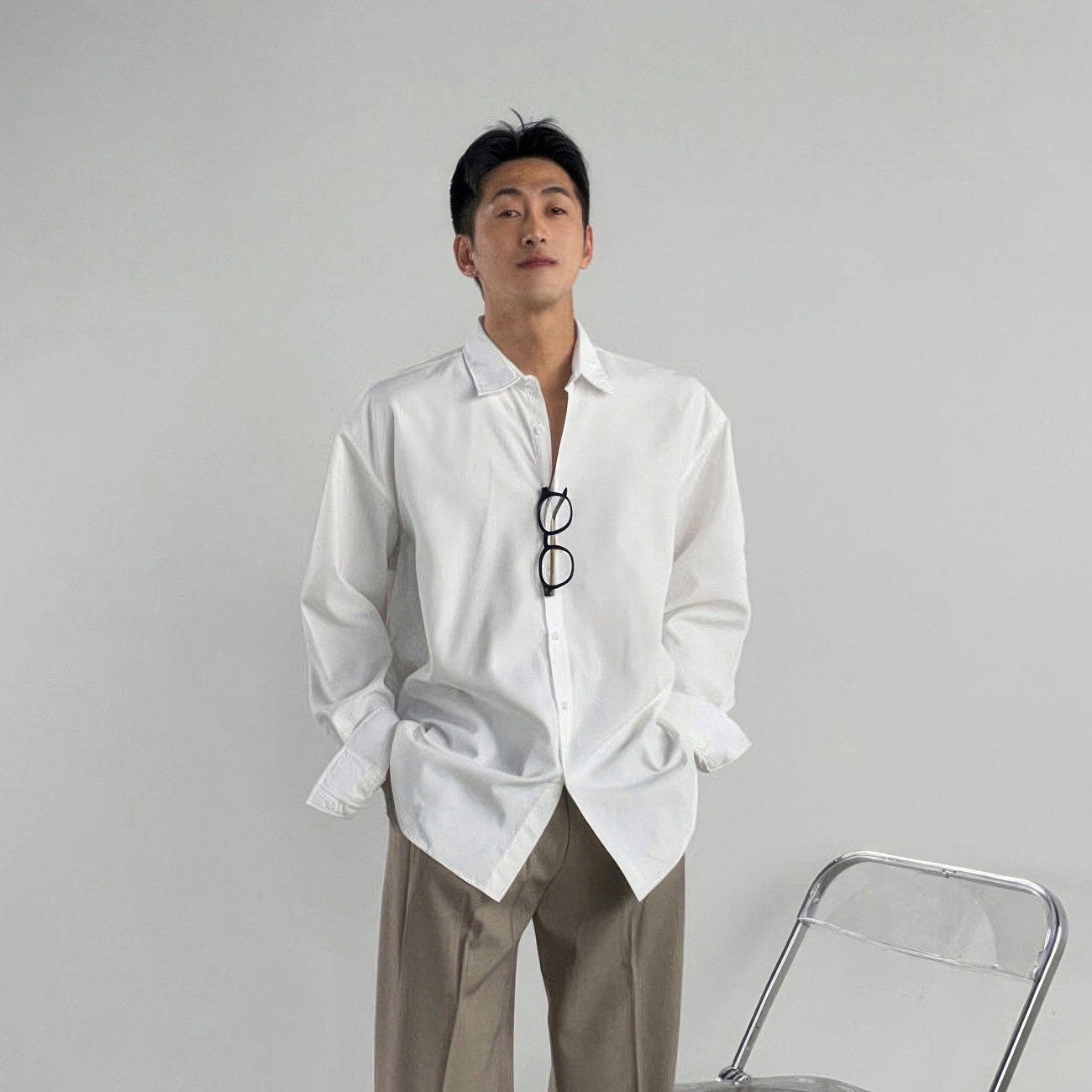 黑色痞帅长袖衬衫男士春秋韩版高品质慵懒风寸衫chic垂感休闲衬衣