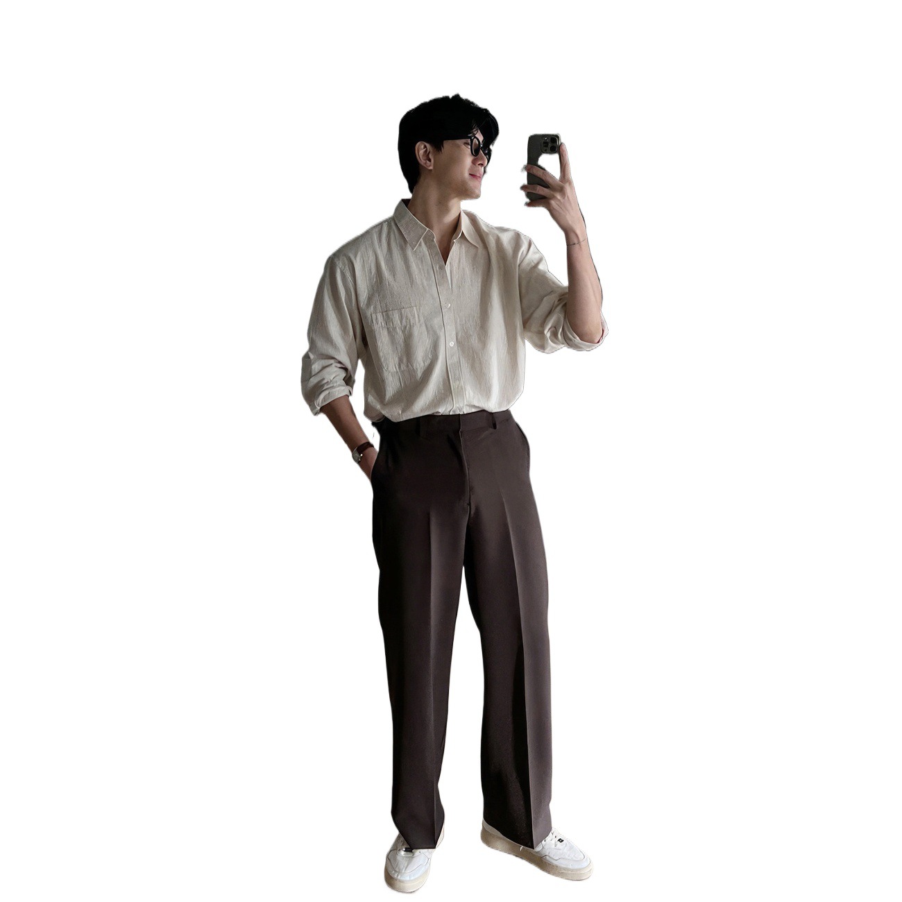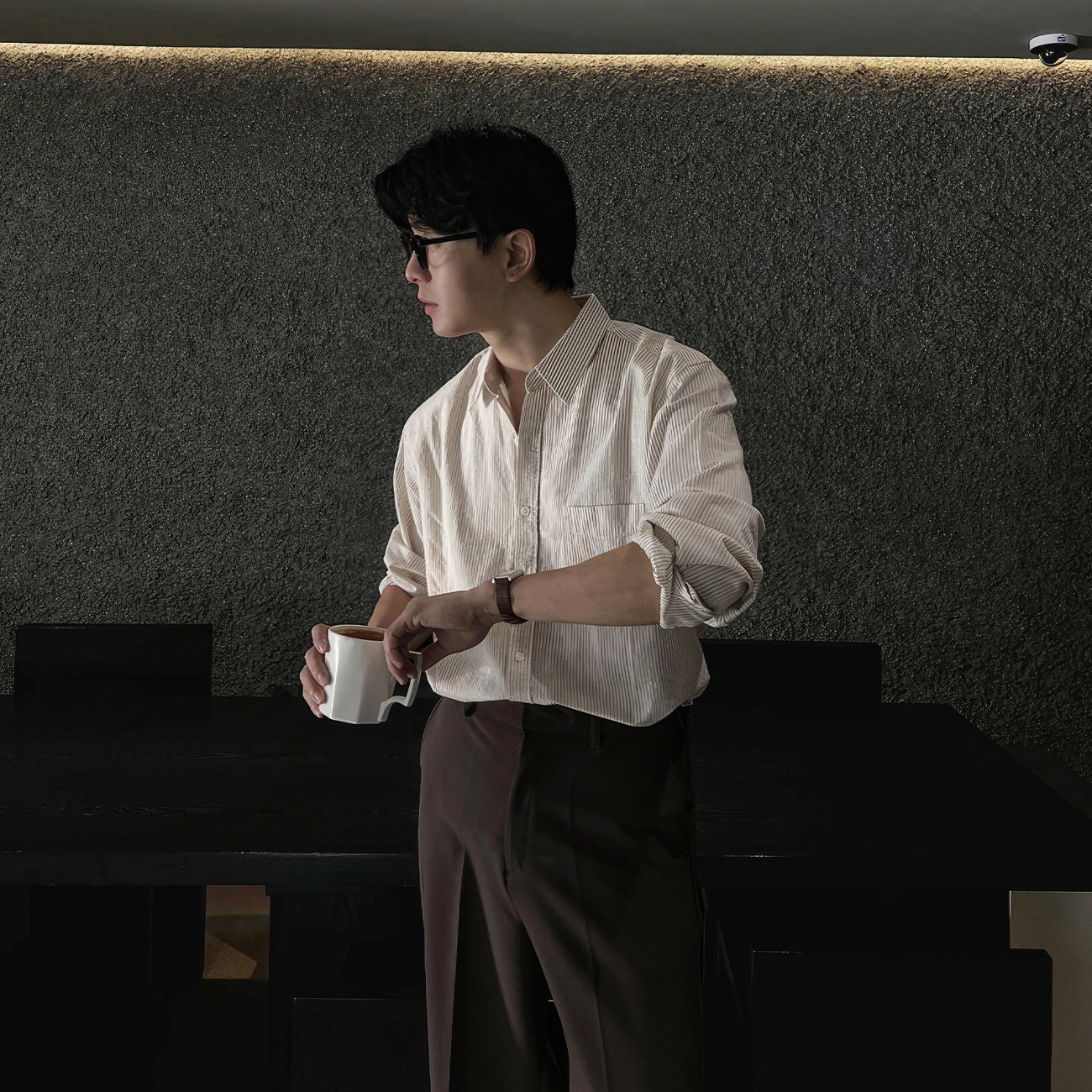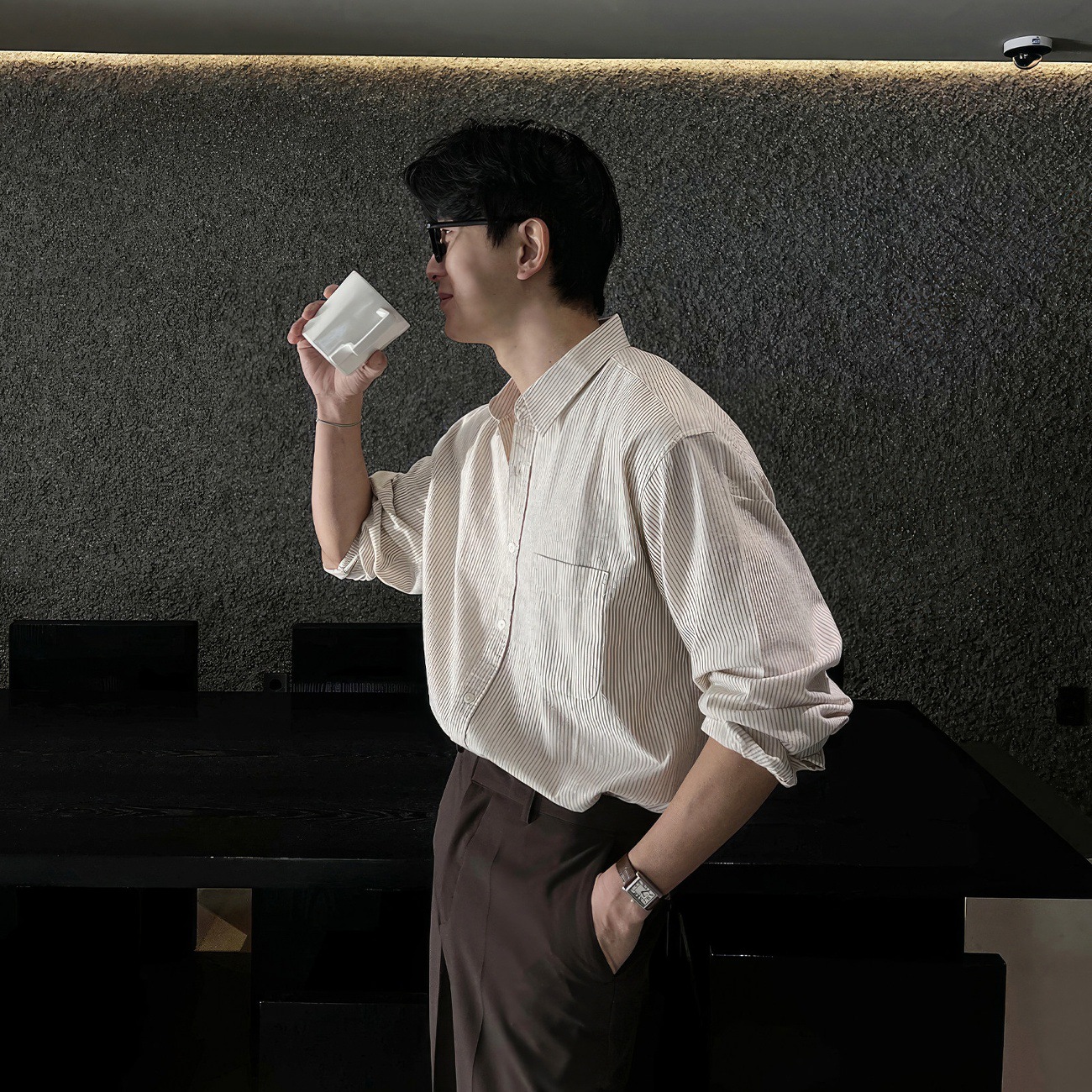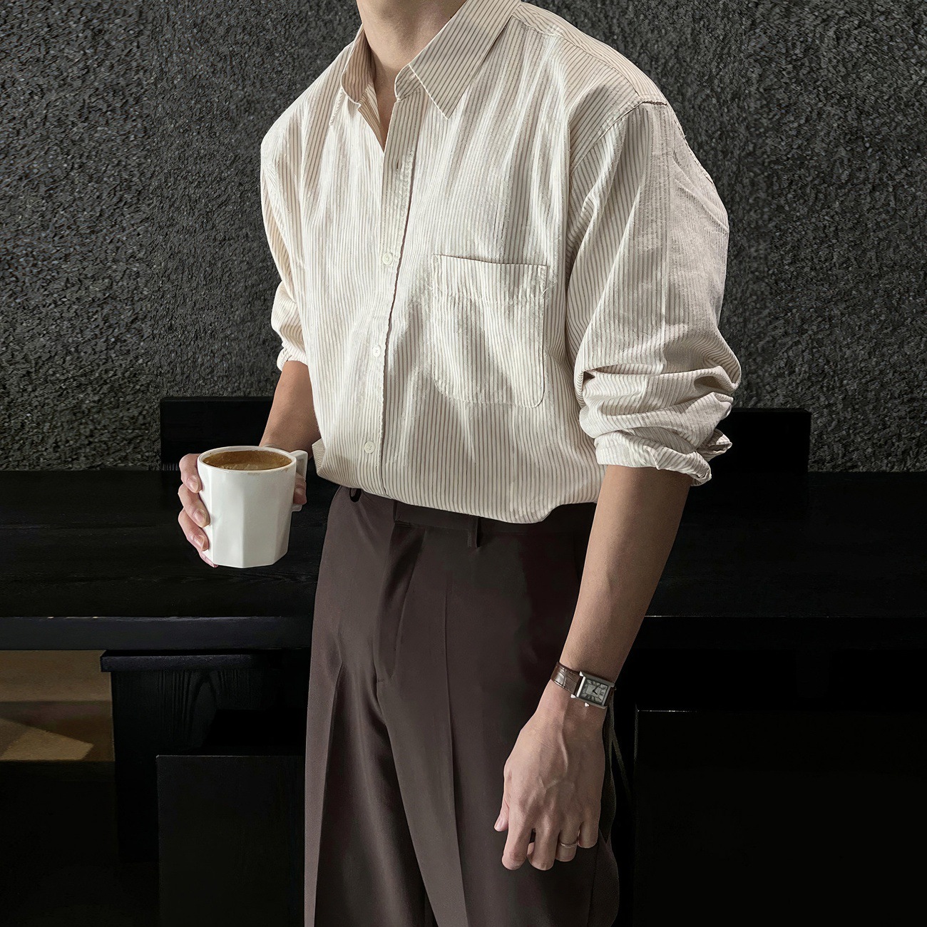 杏色条纹长袖衬衫男士春秋韩系高品质轻熟风商务寸衫休闲翻领衬衫