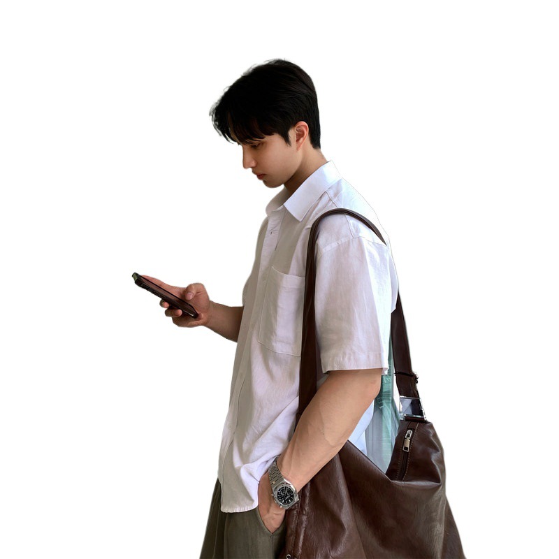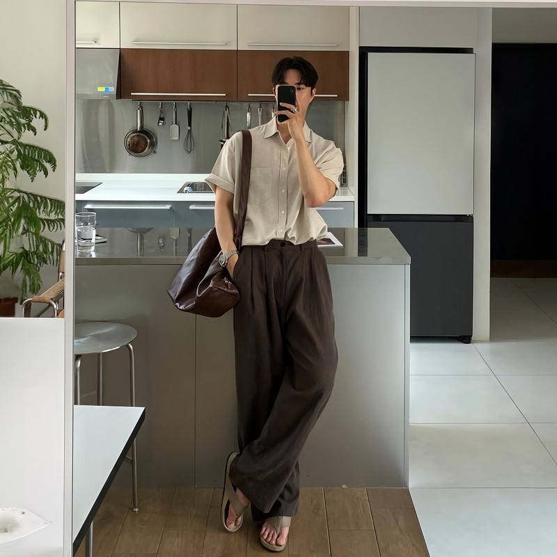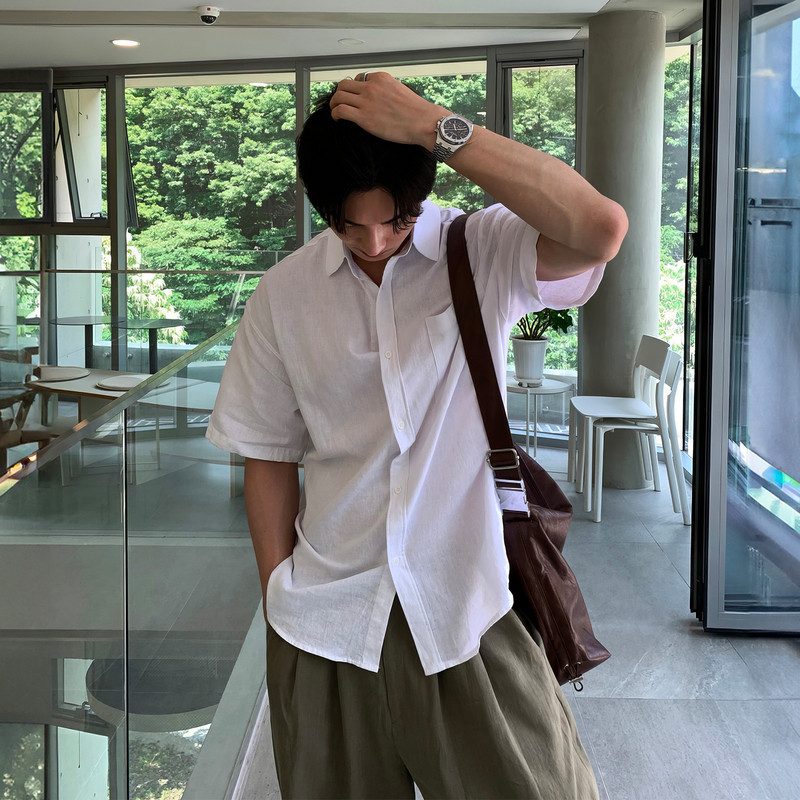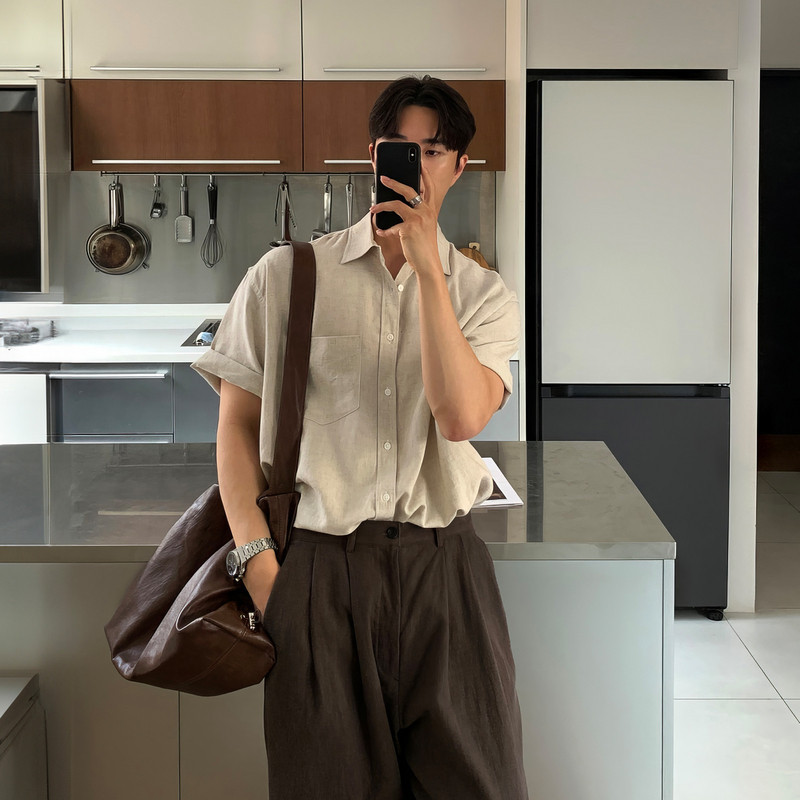 卡其色亚麻短袖衬衫男夏季薄款简约百搭高级感衬衣休闲轻熟风上衣