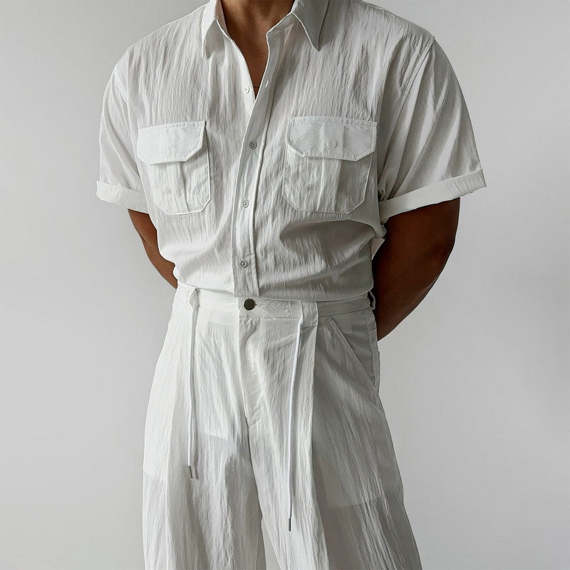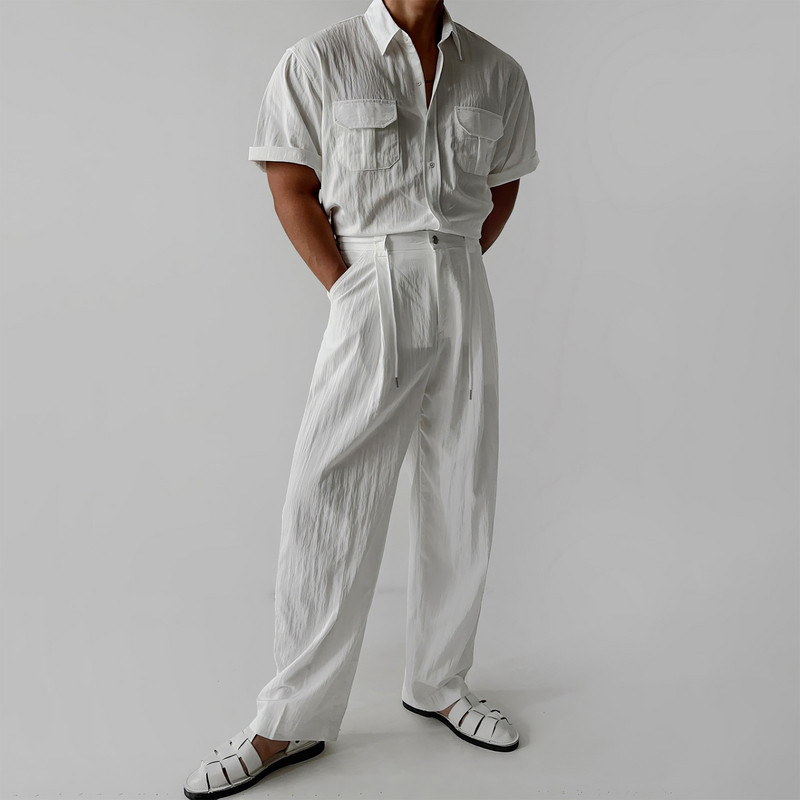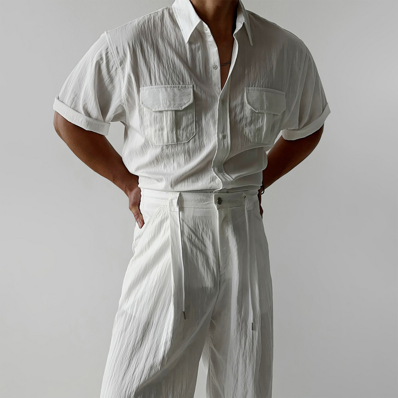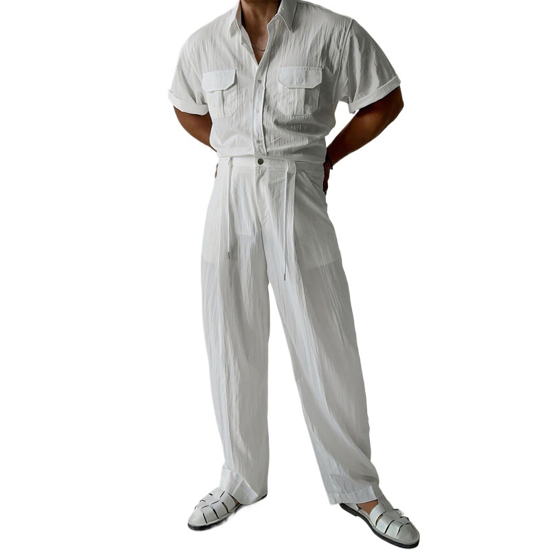 白色翻领短袖衬衫套装男夏季韩版时尚百搭直筒裤宽松垂感阔腿裤子