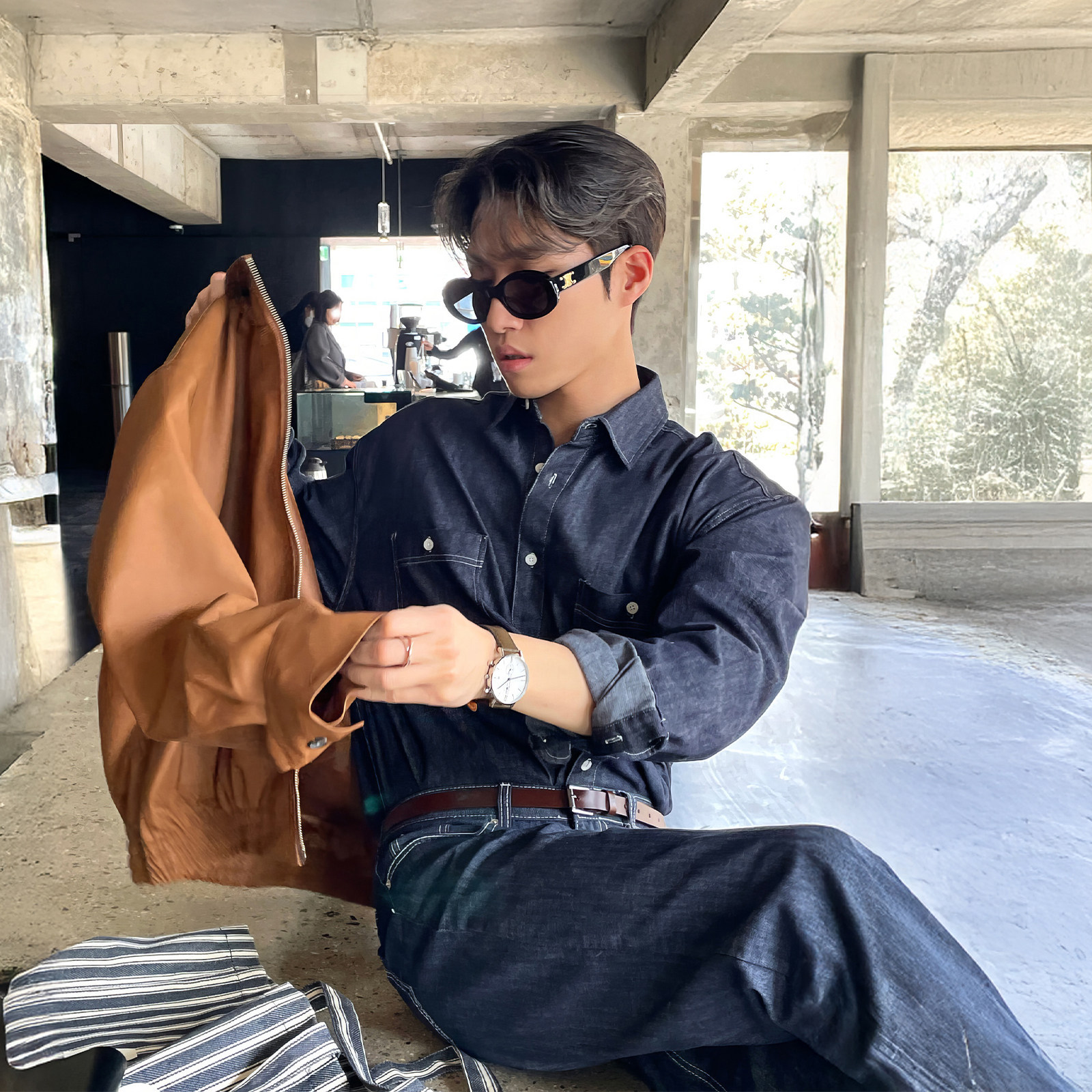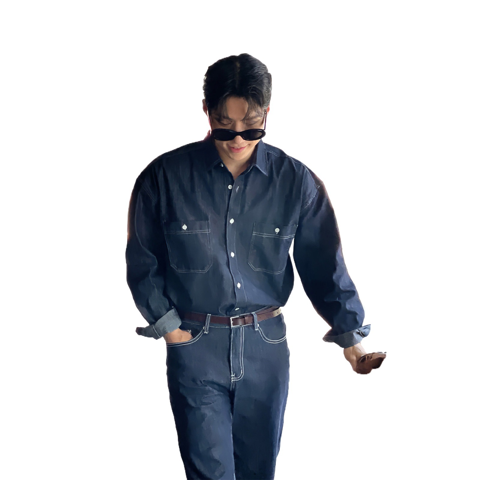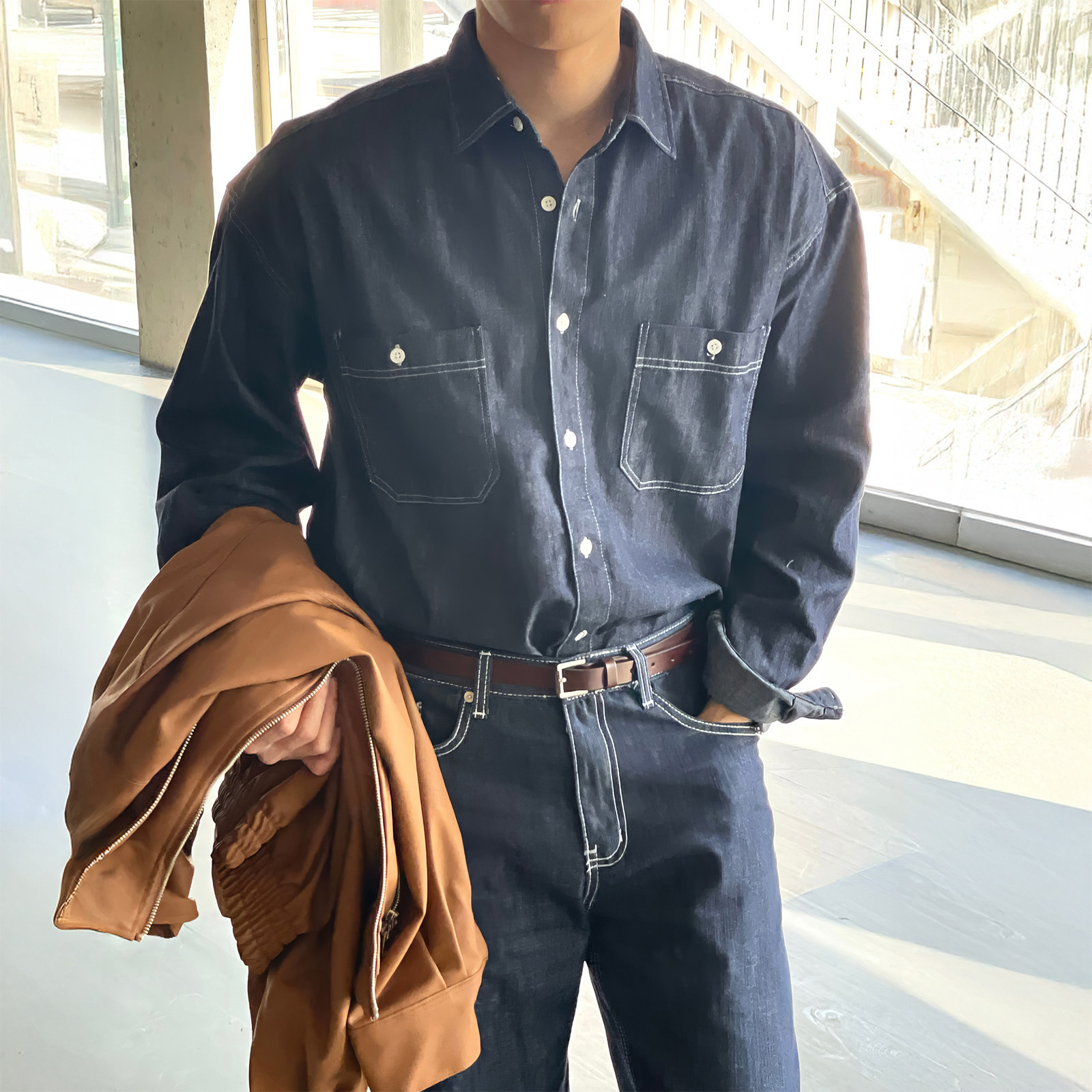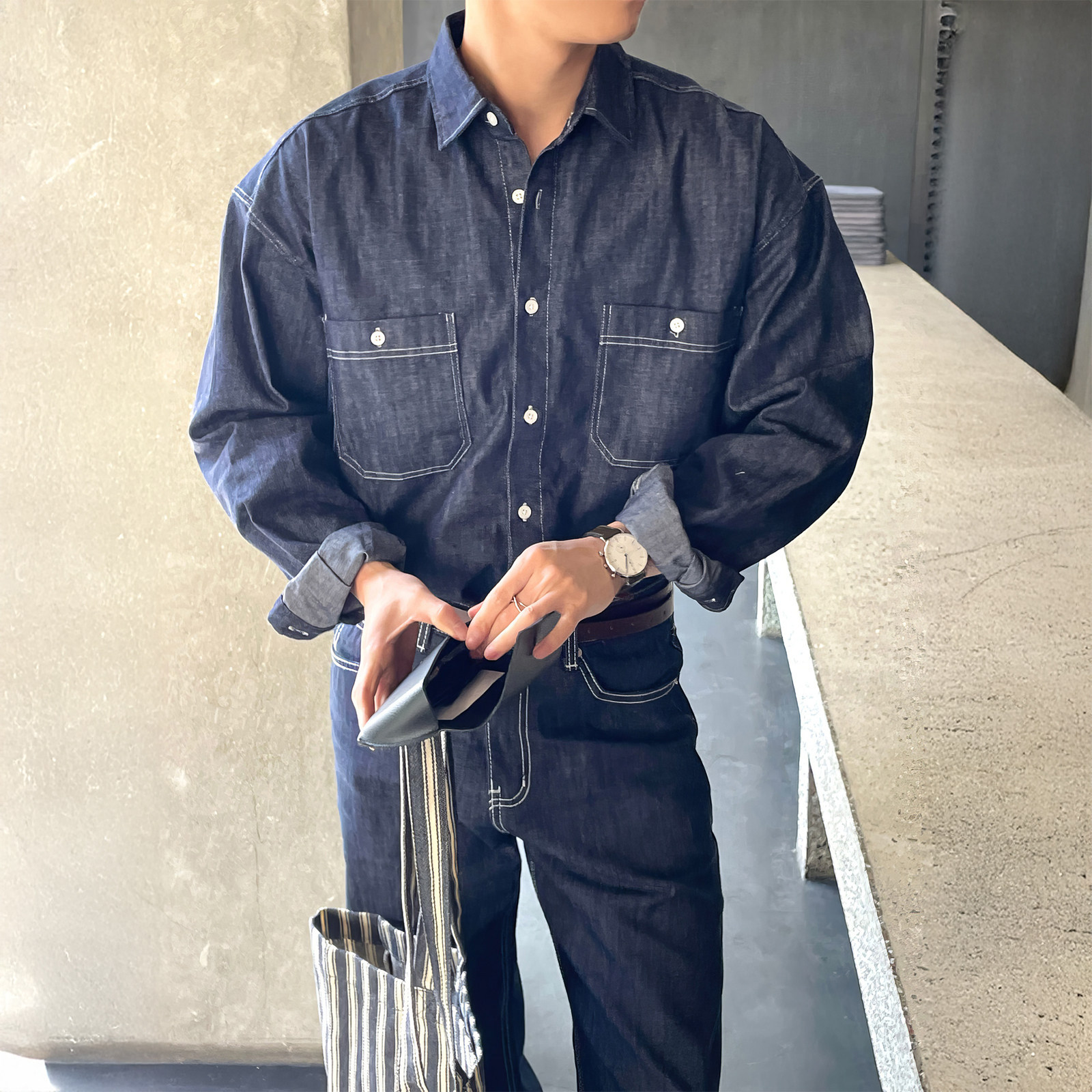 韩系西部牛仔长袖衬衫男款轻熟风双口袋宽松休闲水洗做旧衬衣外套