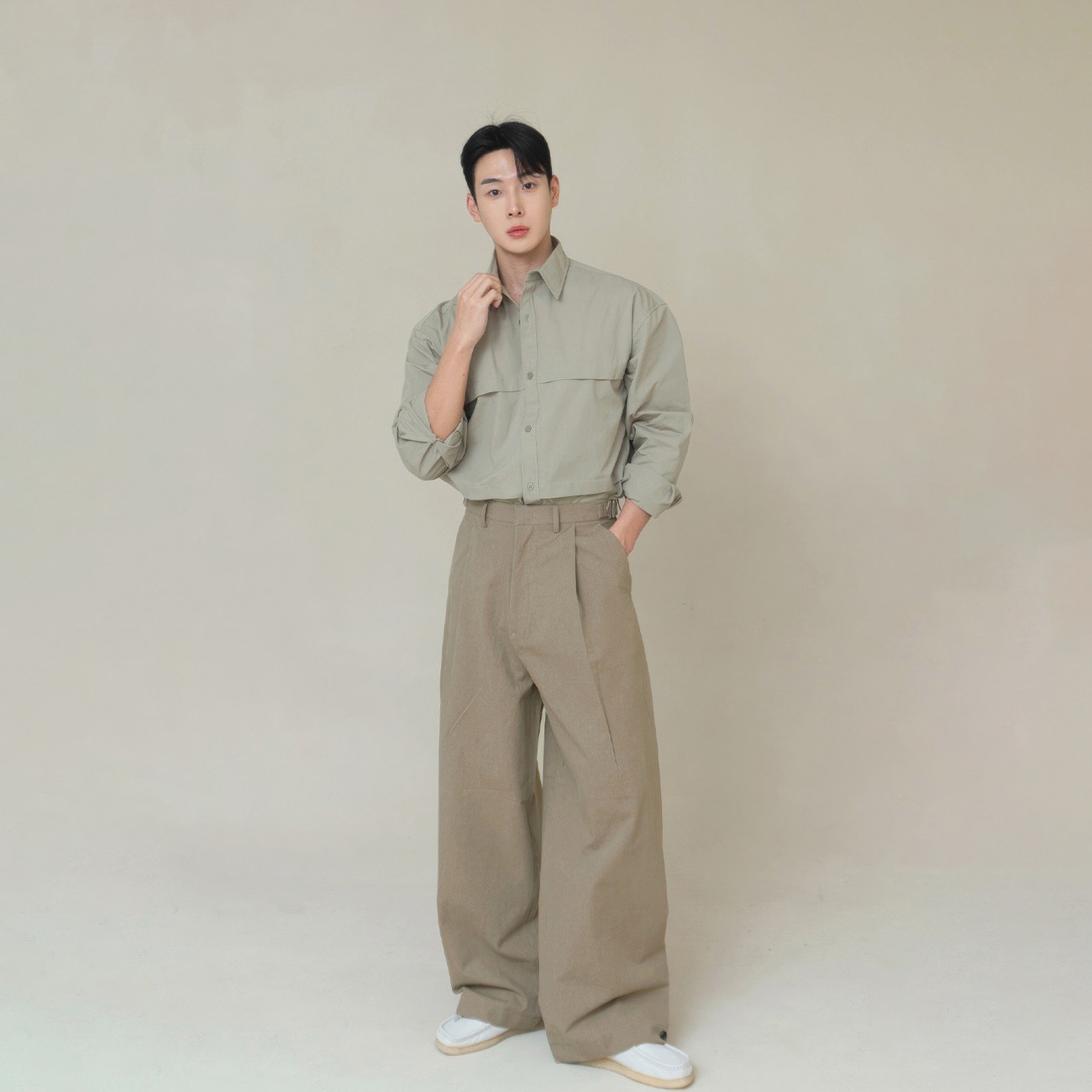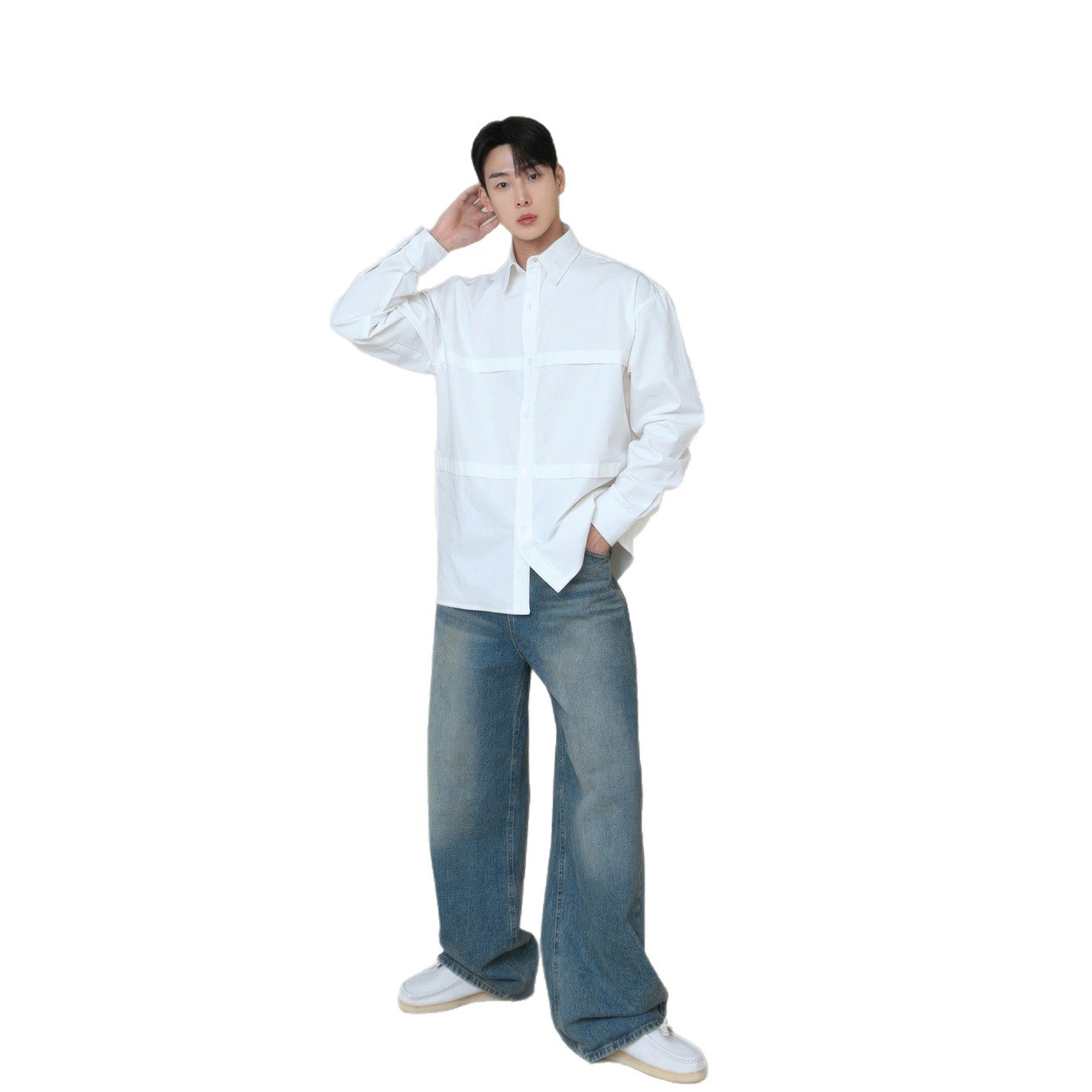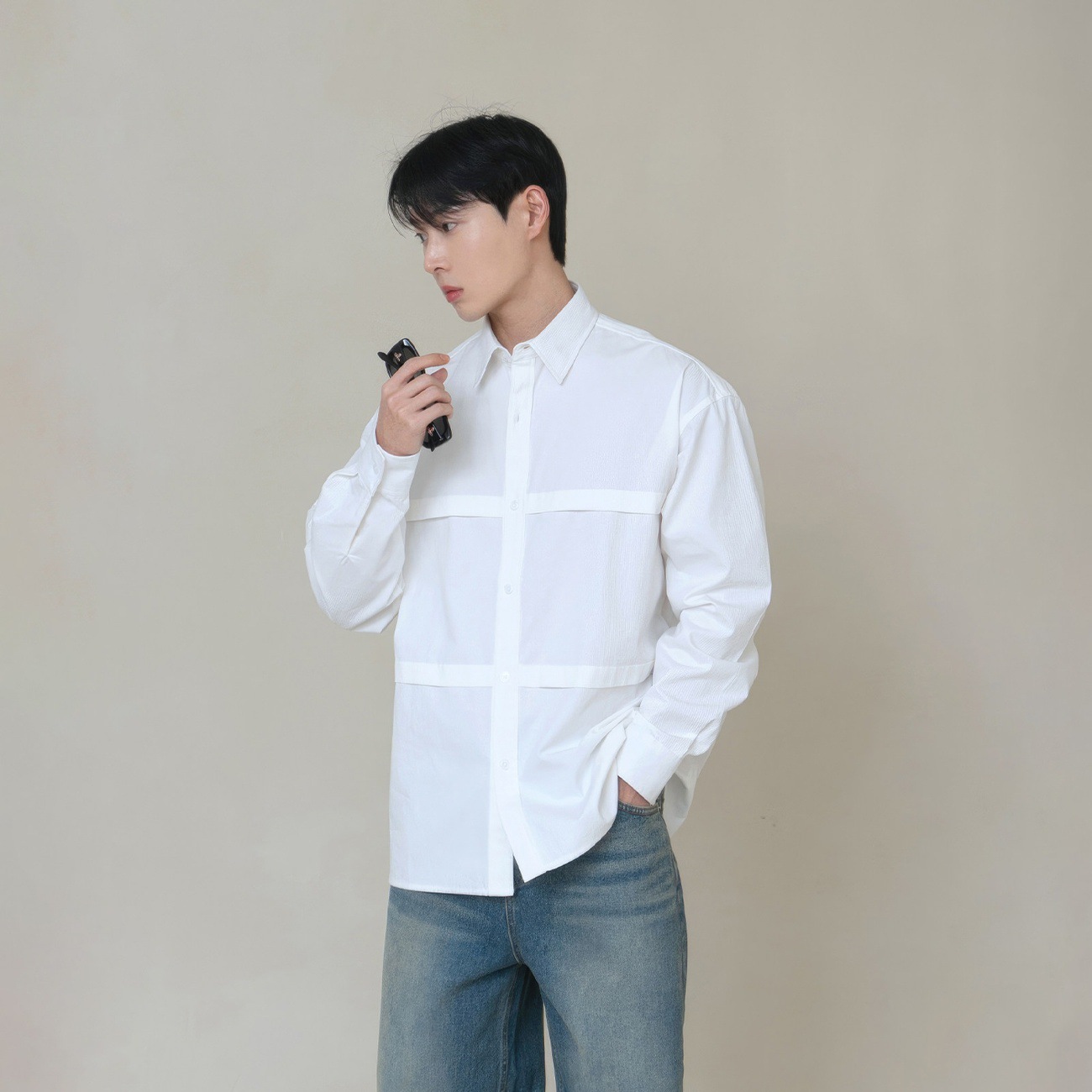 翻领长袖工装衬衫男士韩版高品质叠层拼接设计少年感休闲痞帅衬衣