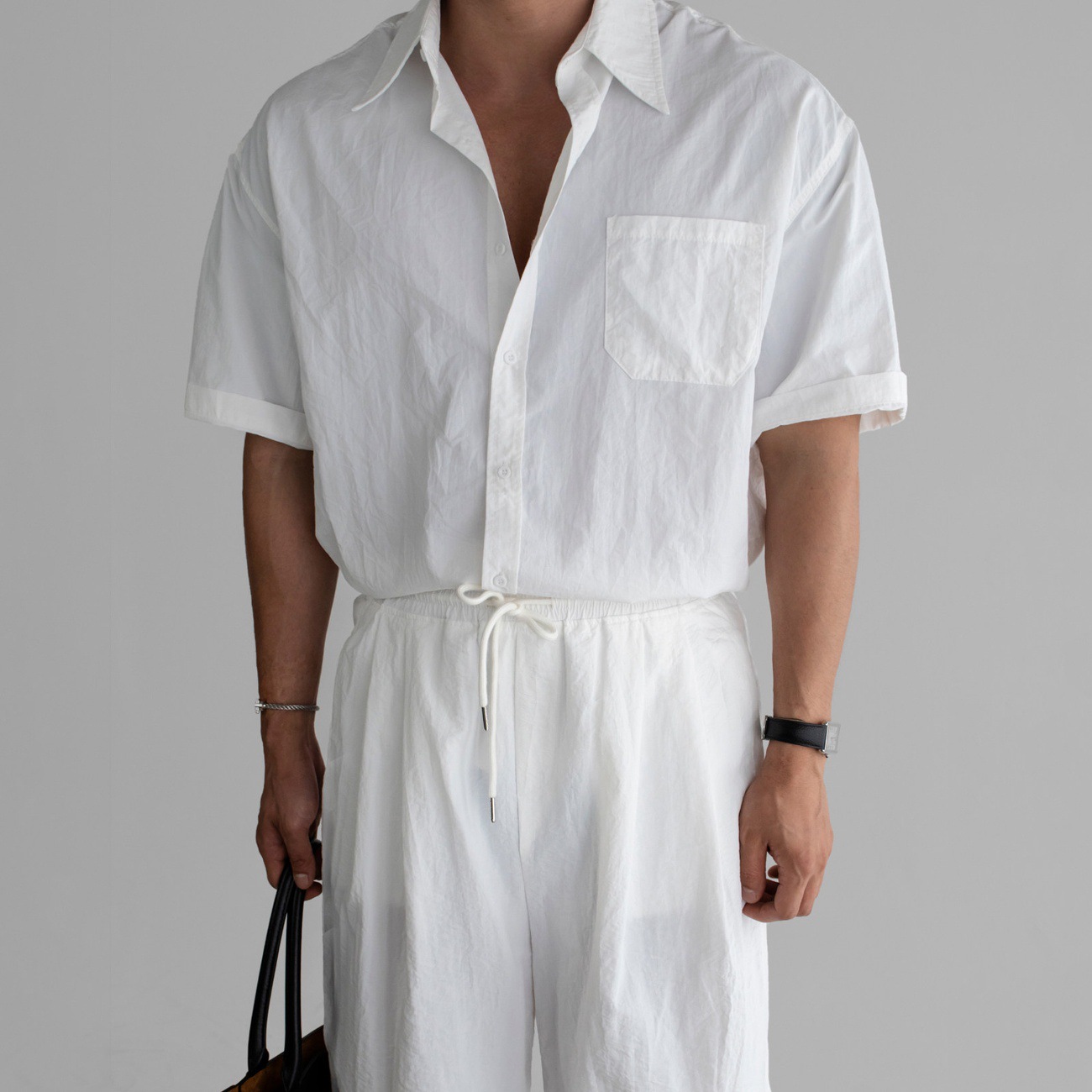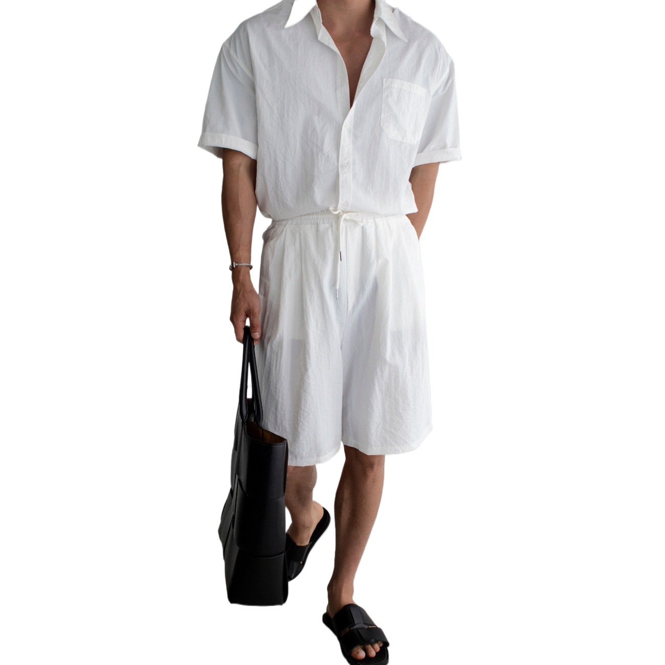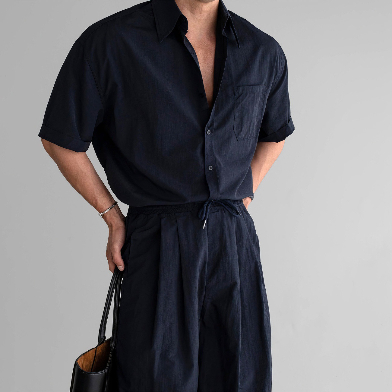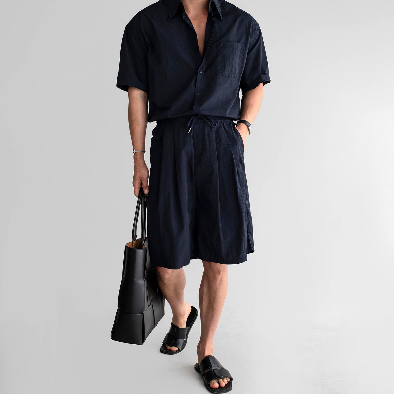 深蓝色短袖衬衫短裤套装男夏季薄款透气休闲衬衣抽绳松紧腰五分裤