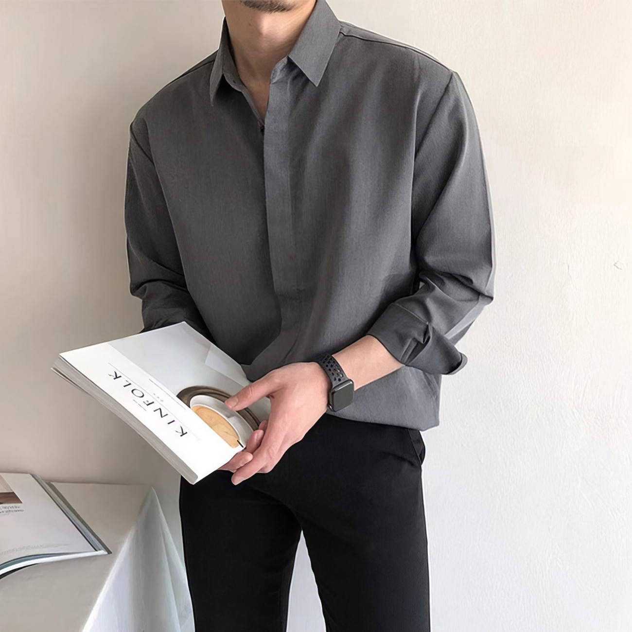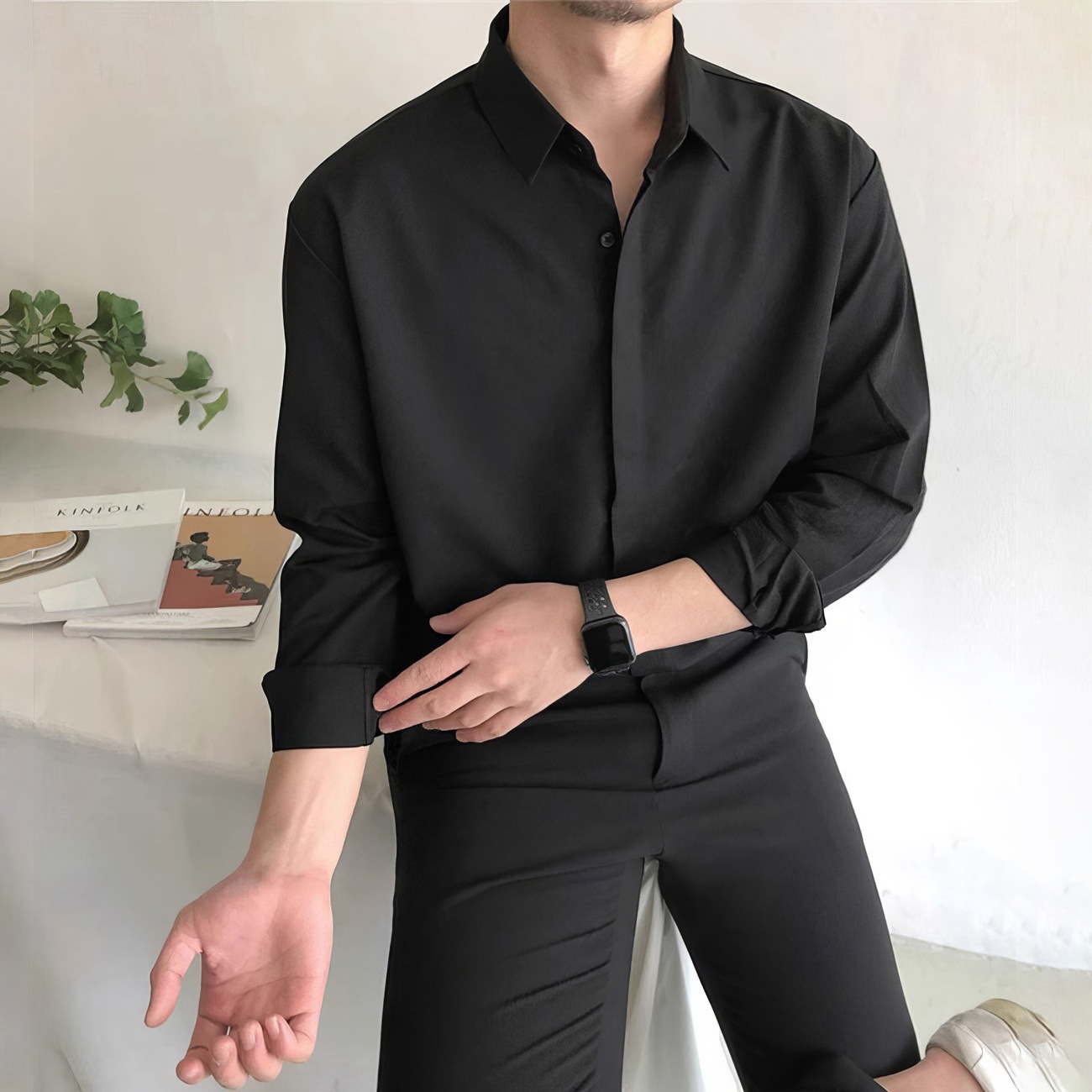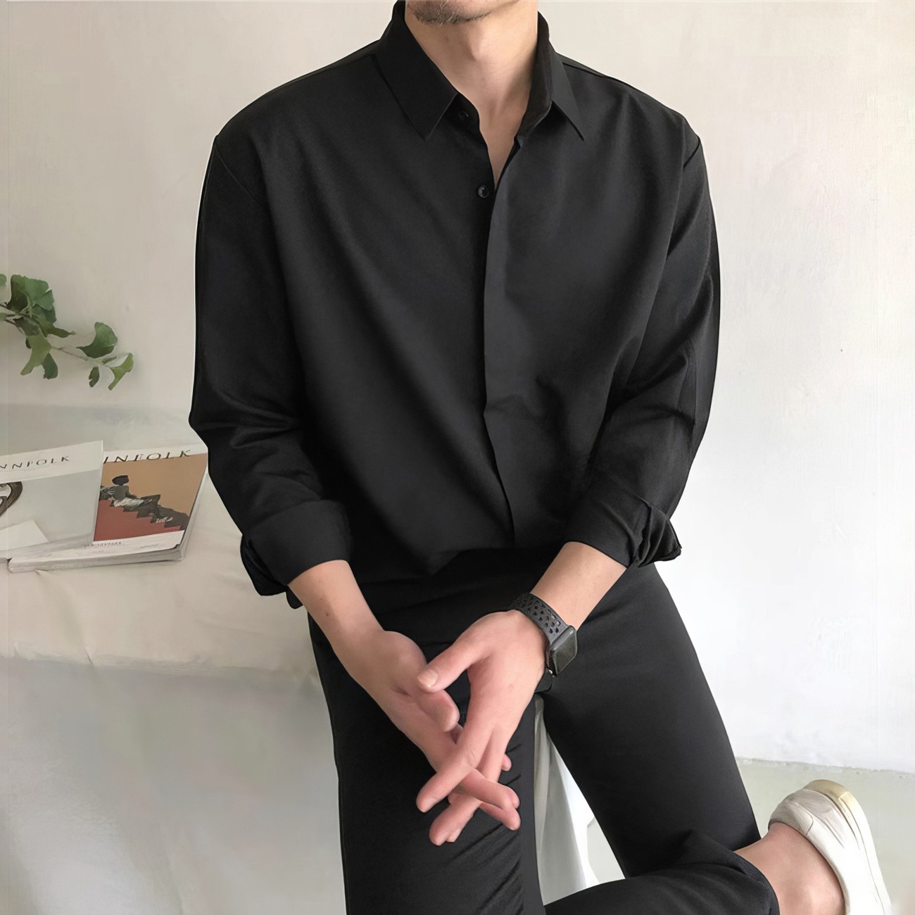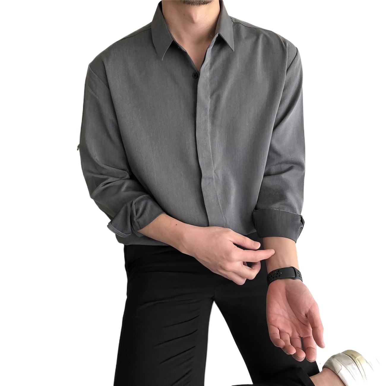 顺滑垂感隐形纽扣长袖衬衫男士春秋港风纯色内搭上衣洋气免烫外套