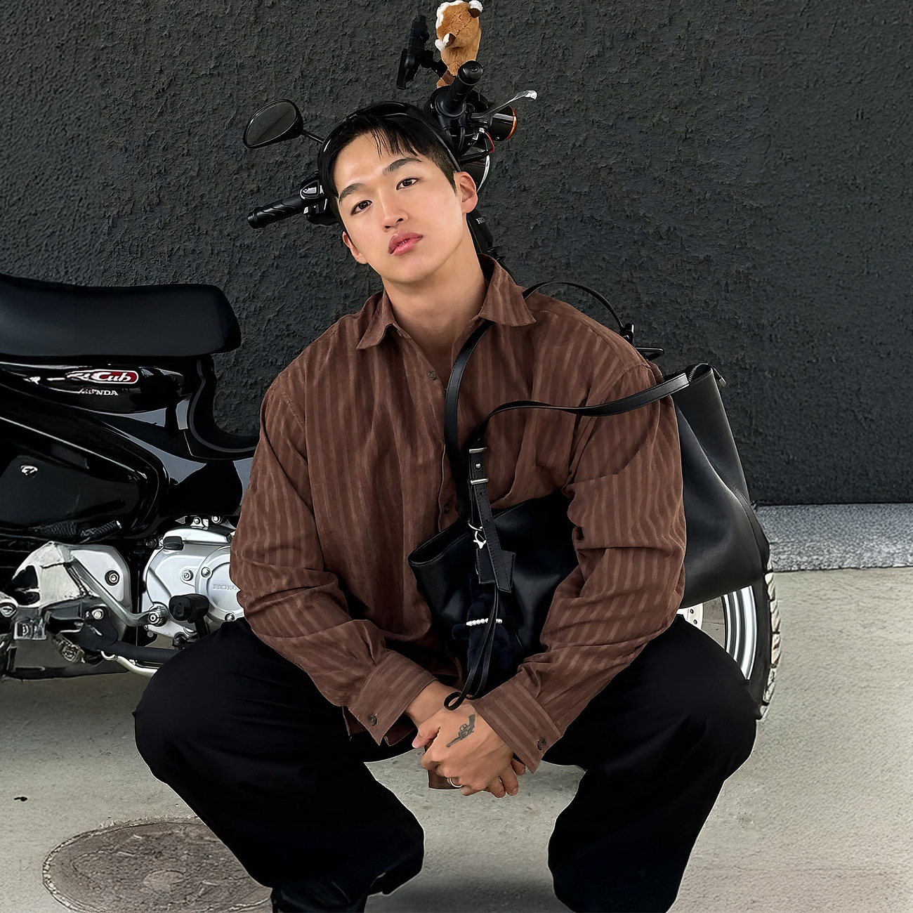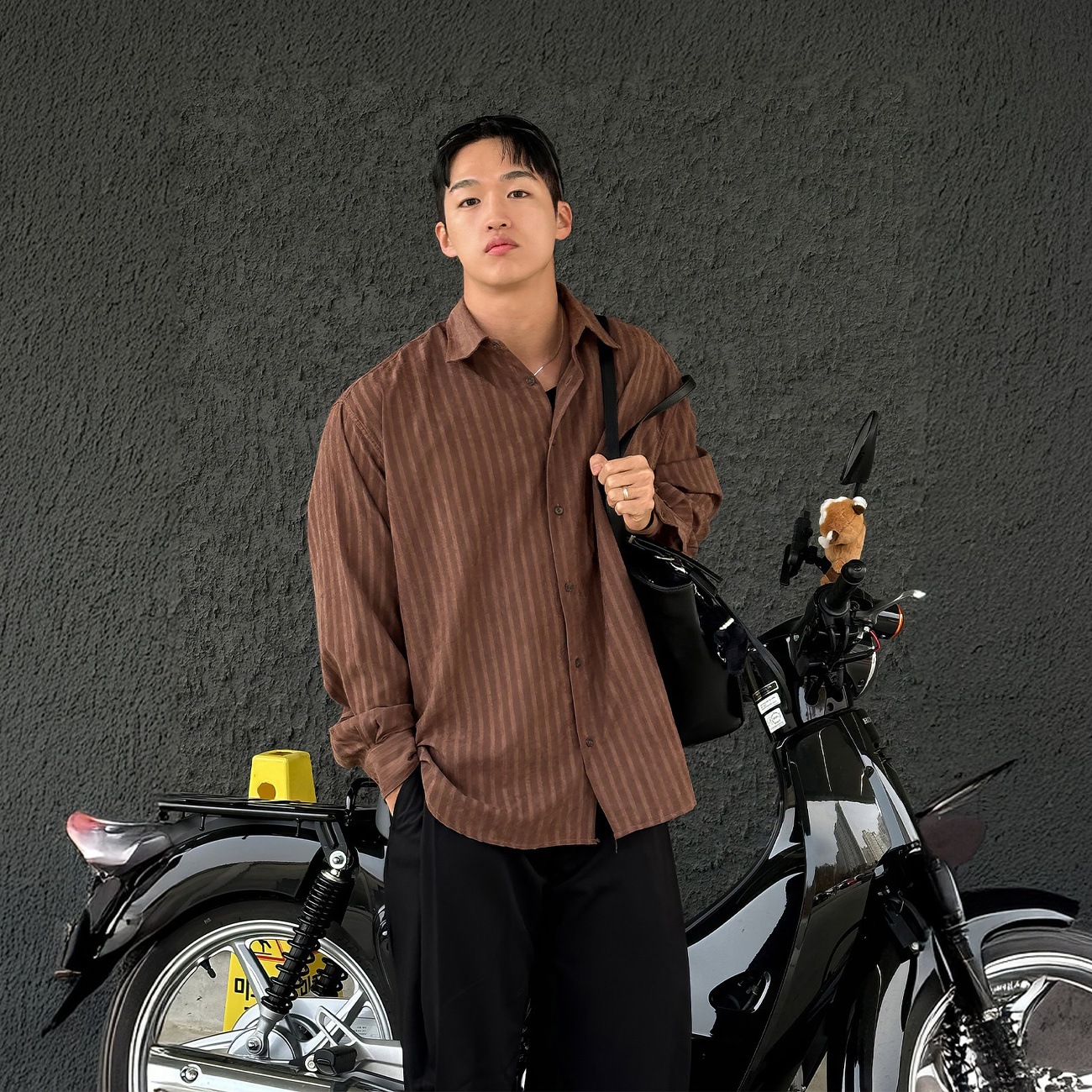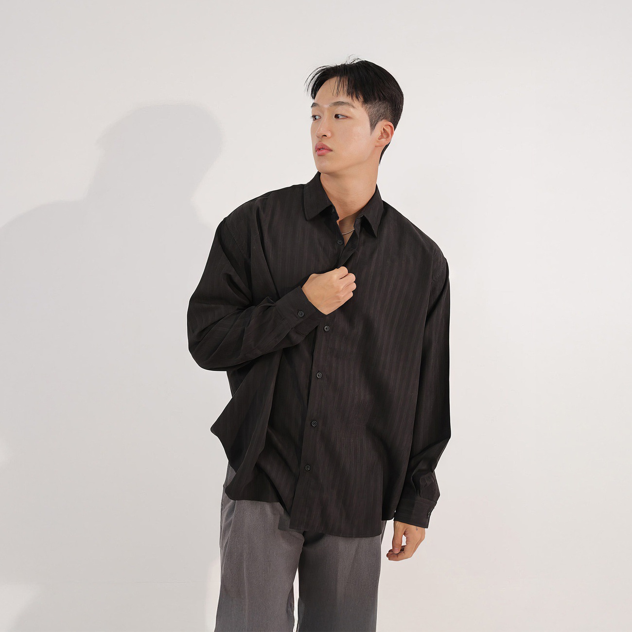 棕色竖条纹翻领长袖衬衫男款春秋韩系简约高级感商务通勤百搭衬衣