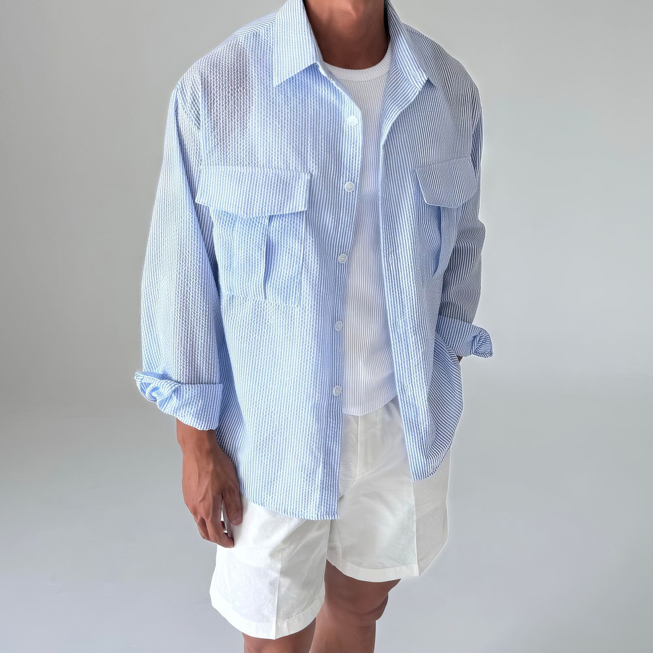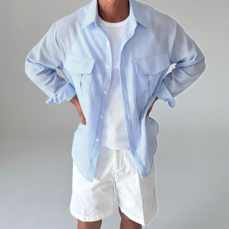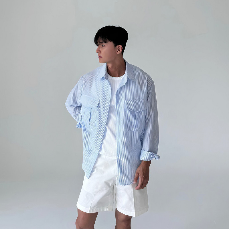 蓝色条纹长袖衬衫男士春季2026新款韩系宽松休闲翻领衬衣防晒外套