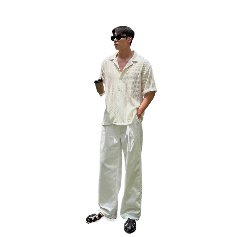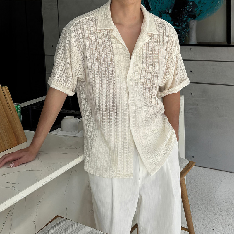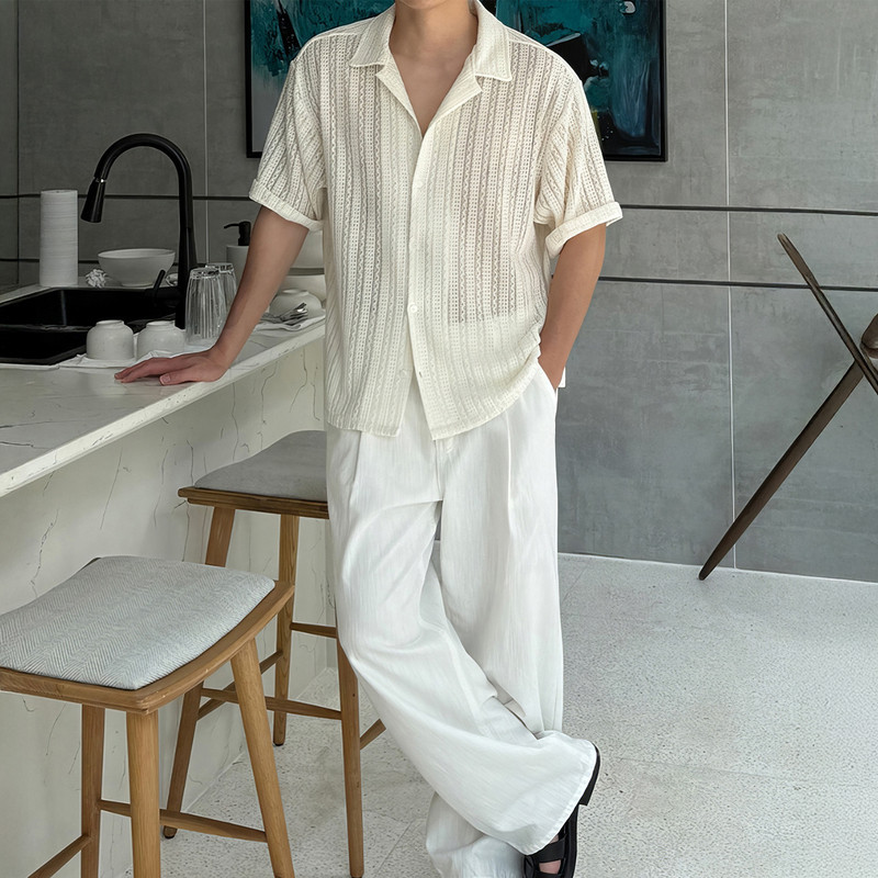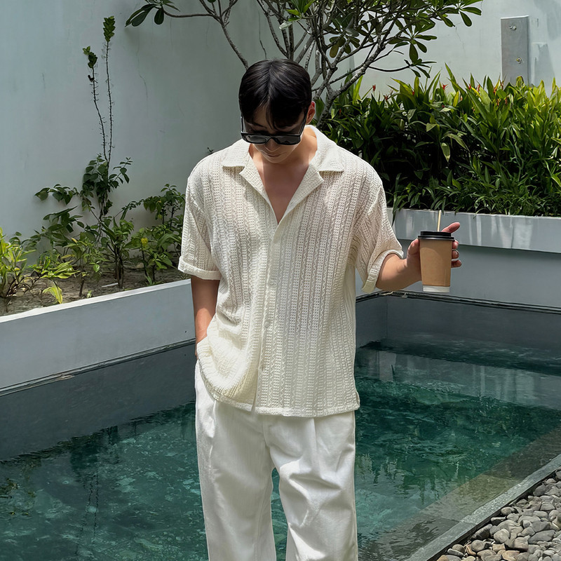 镂空古巴领短袖衬衫男生夏季宽松休闲半袖翻领衬衣高级感抗皱上衣