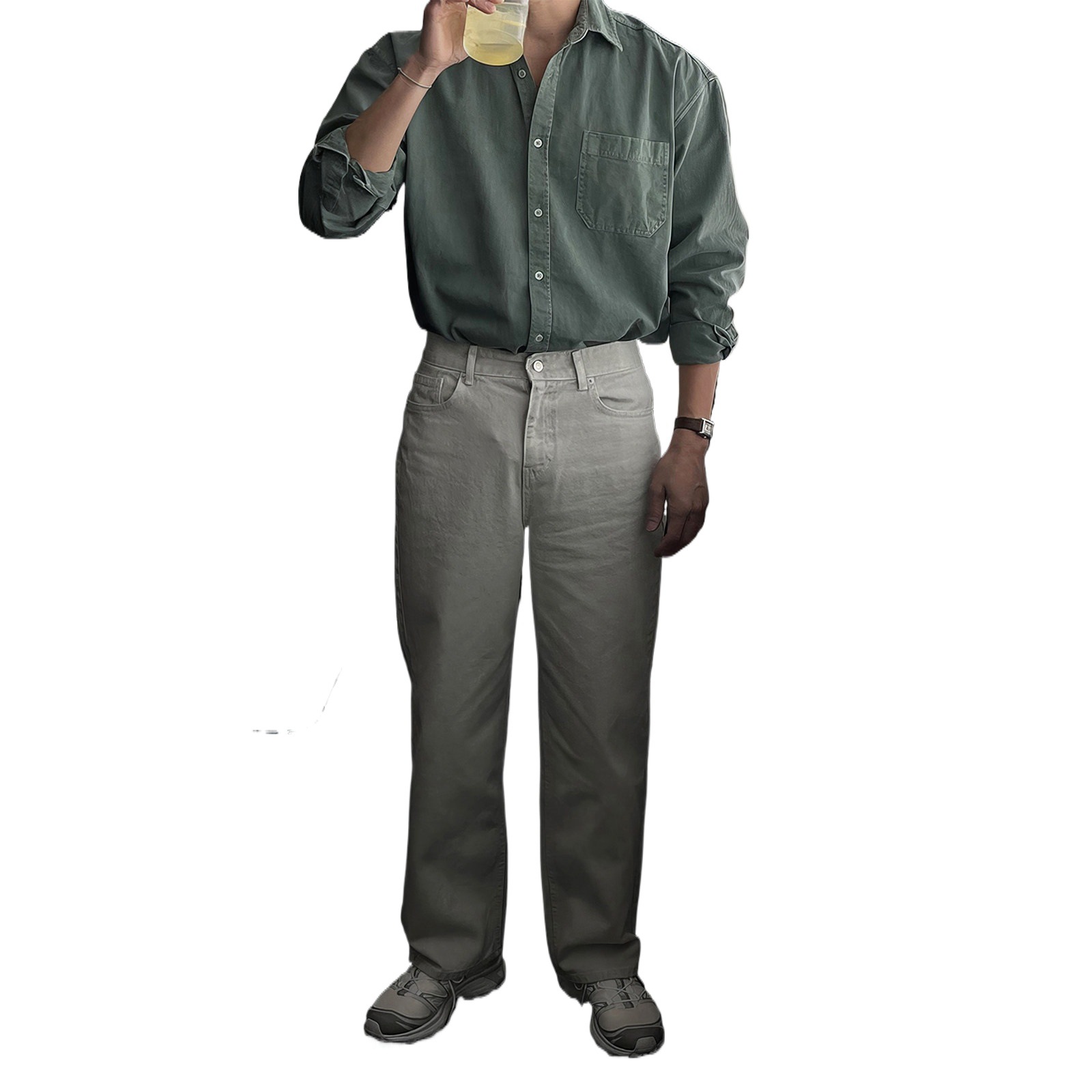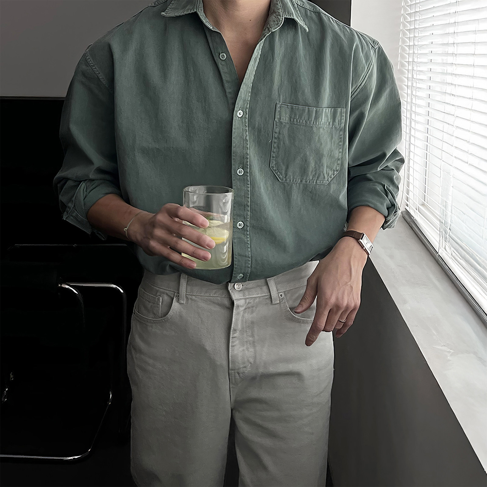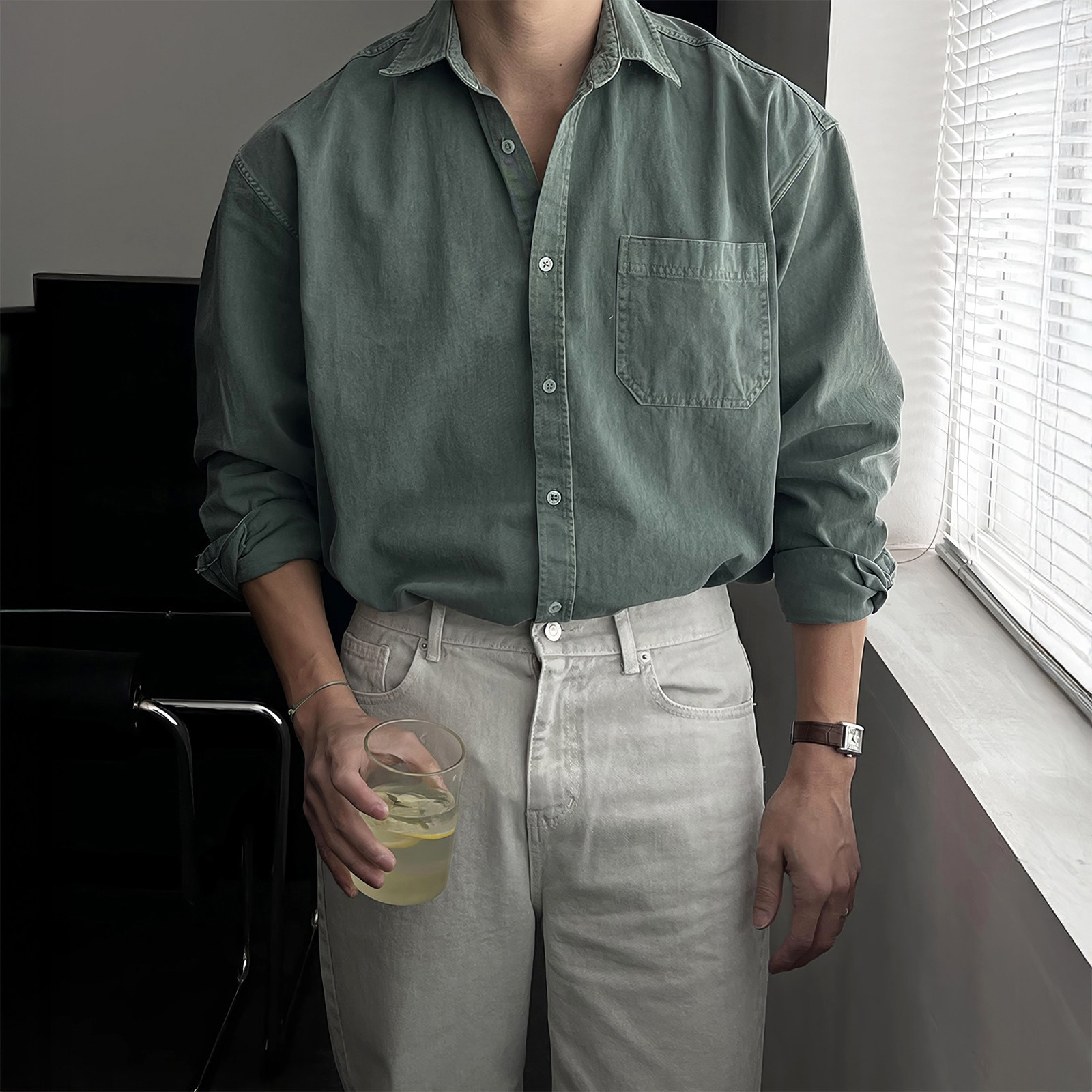复古风水洗衬衫男款春夏绿色复古做旧衬衣韩系穿搭高级感轻熟上衣