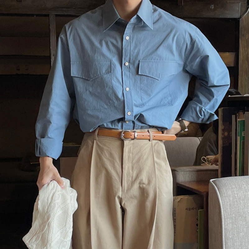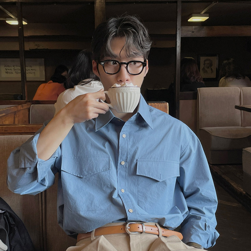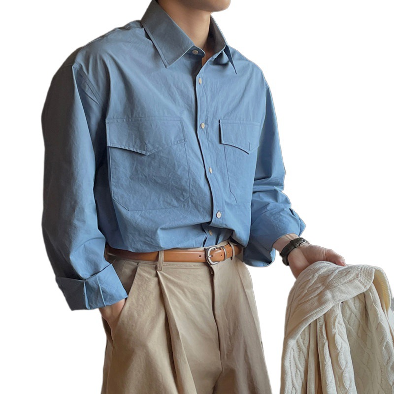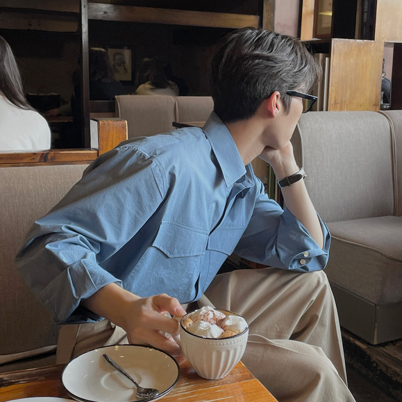 长袖衬衫男蓝色休闲内搭衬衫长袖上衣日系宽松复古高级感潮牌外套