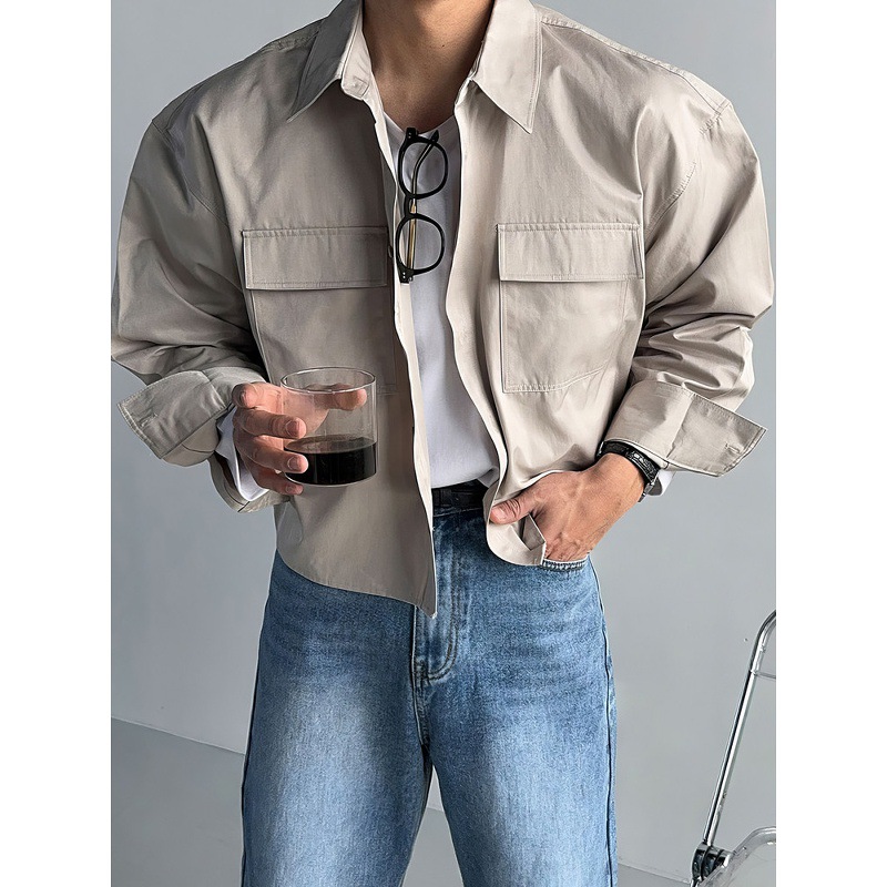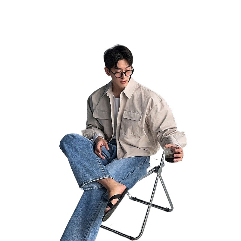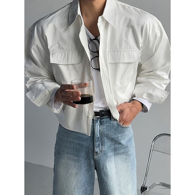 白色重工短款长袖衬衫外套男春季双口袋小众设计寸衫翻领开衫衬衣