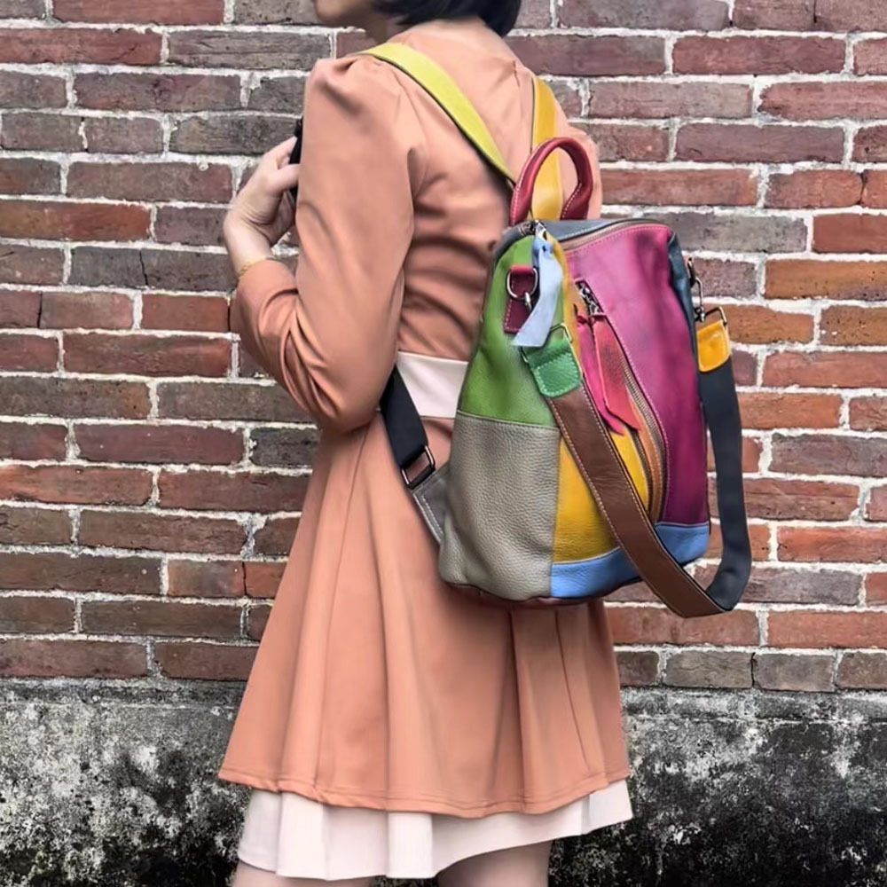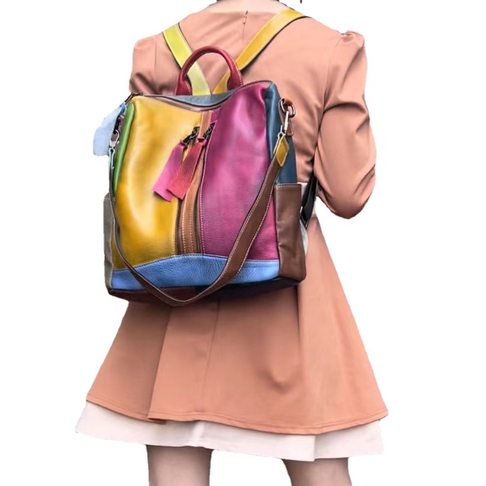 时尚潮流复古女包真皮手提包擦色双肩包背包彩色真皮拼接单肩挎包