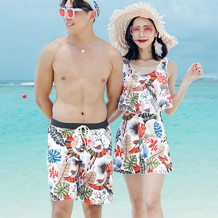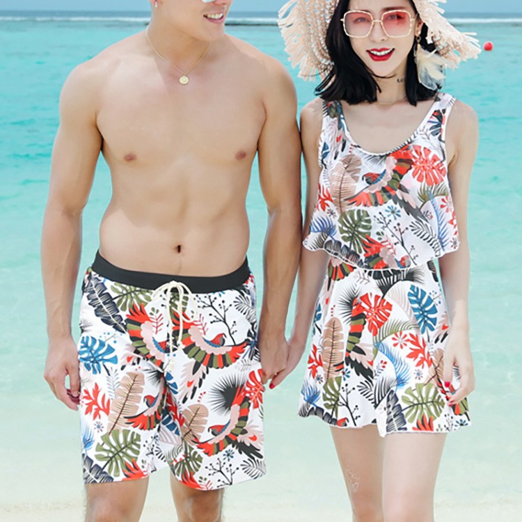 情侣泳衣2025新款海滩海边女裙式分体平角保守男沙滩裤泡温泉套装