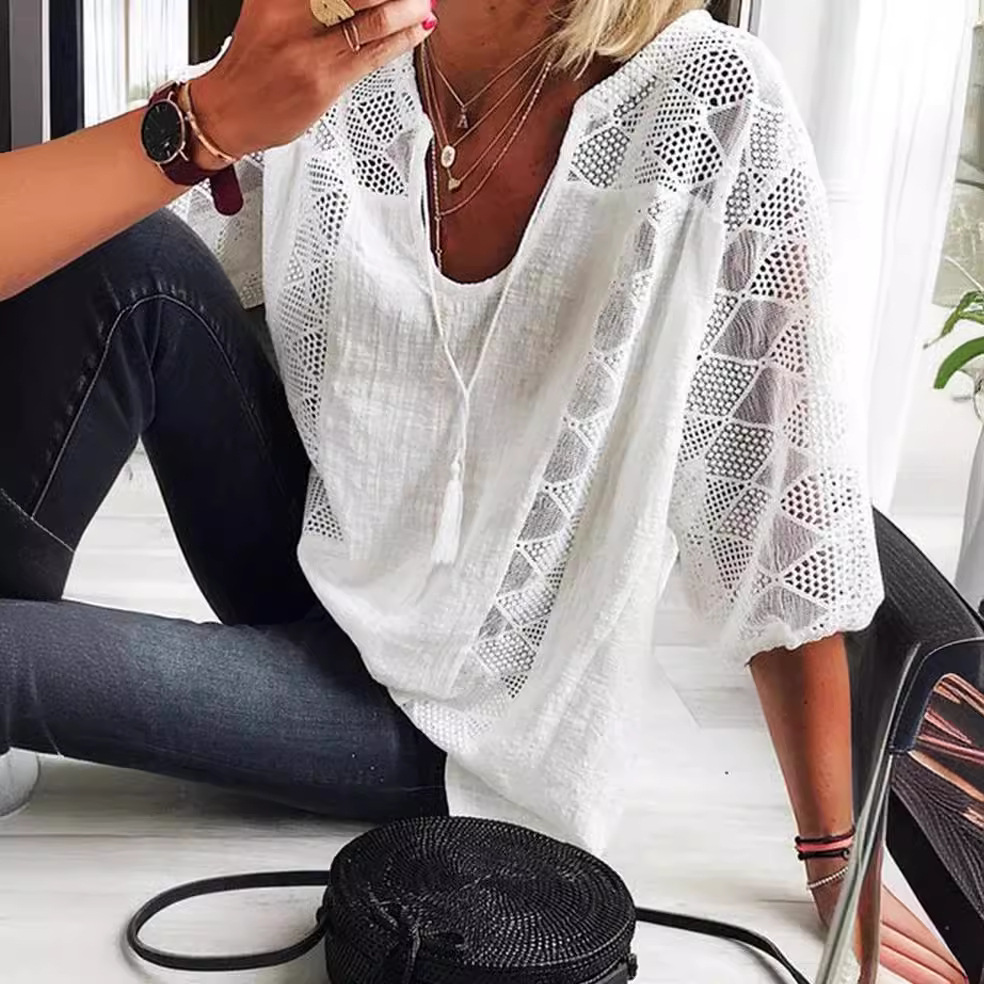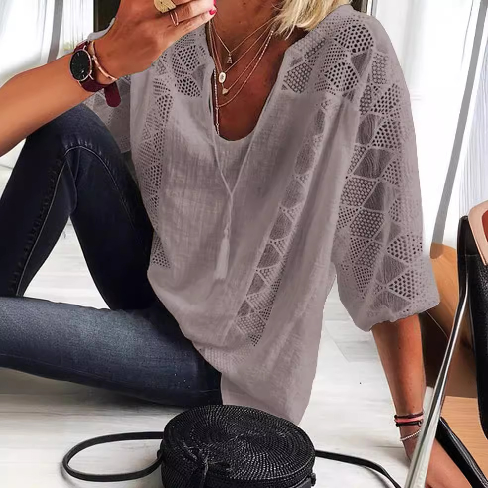 2024 宽松型速卖通 亚马逊wish新款欧美蕾丝拼接U领七分袖上衣