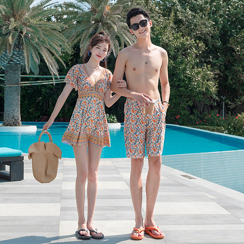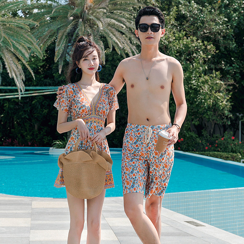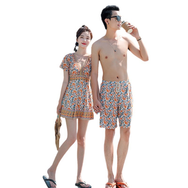2024新款情侣泳装分体裙式加肥大码平角显瘦遮肚游泳衣女男沙滩裤