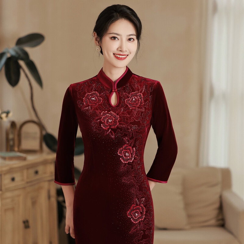 重工2023年春季新款国潮丝绒大片烫钻中袖中长旗袍妈妈装婚礼宴会