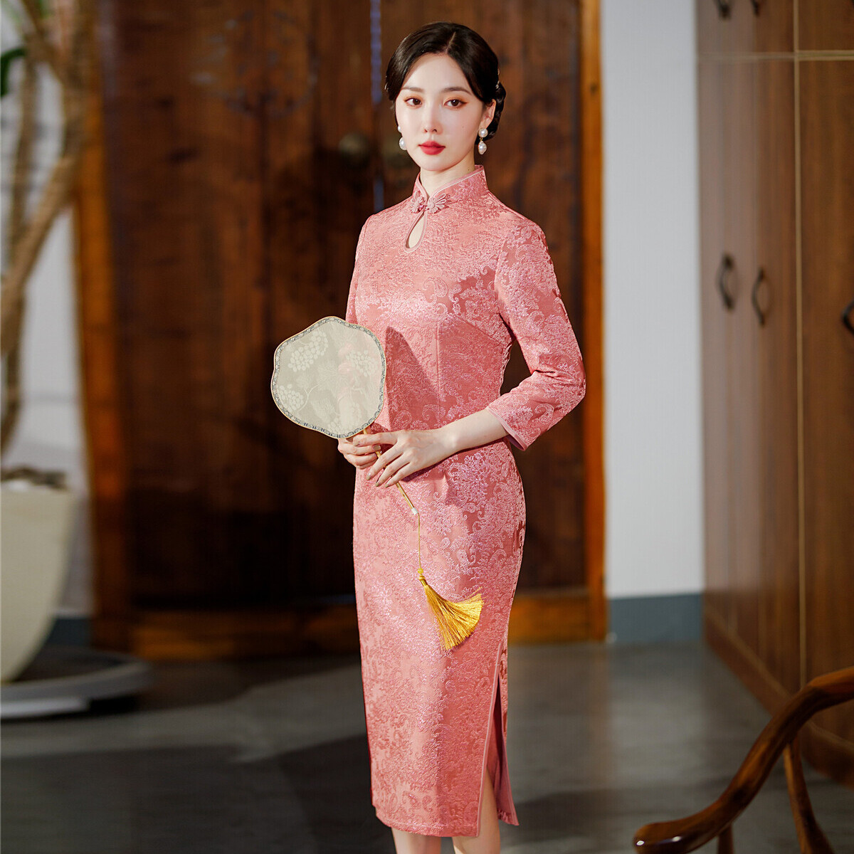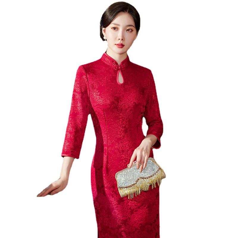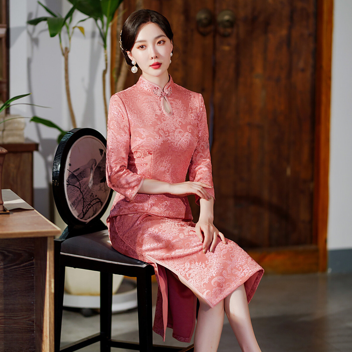 红妆2023年爆款秋冬改良丝绸提花单层水滴领七分袖旗袍大码妈妈装
