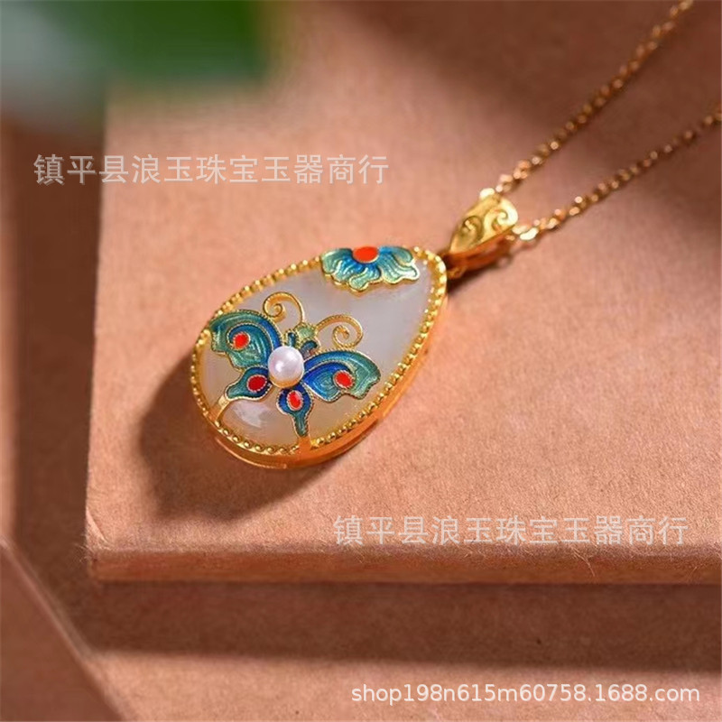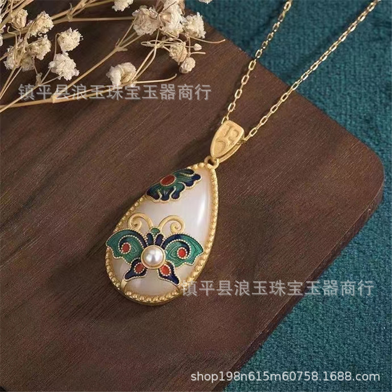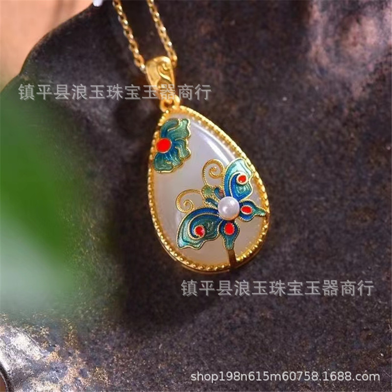 天然玉石新疆金丝玉羊脂白景泰蓝镶嵌水滴吊坠直播货源