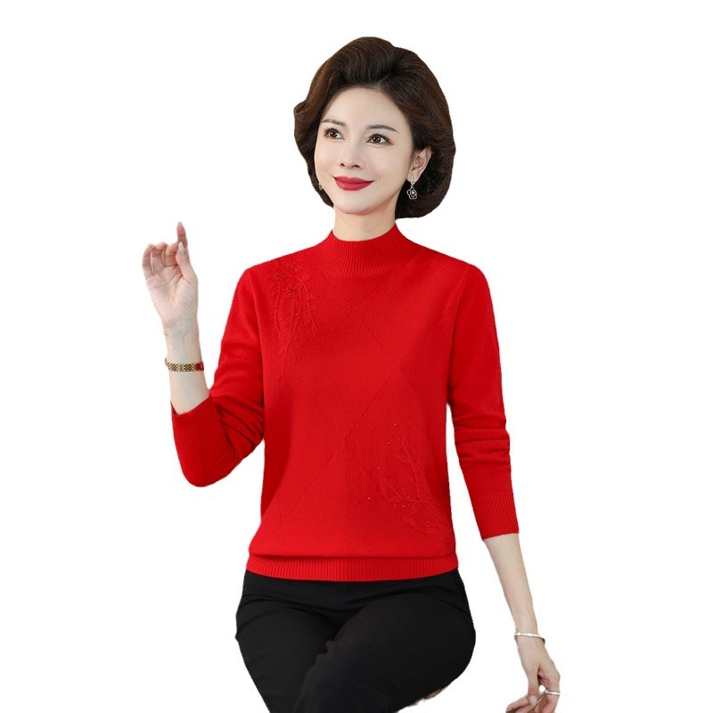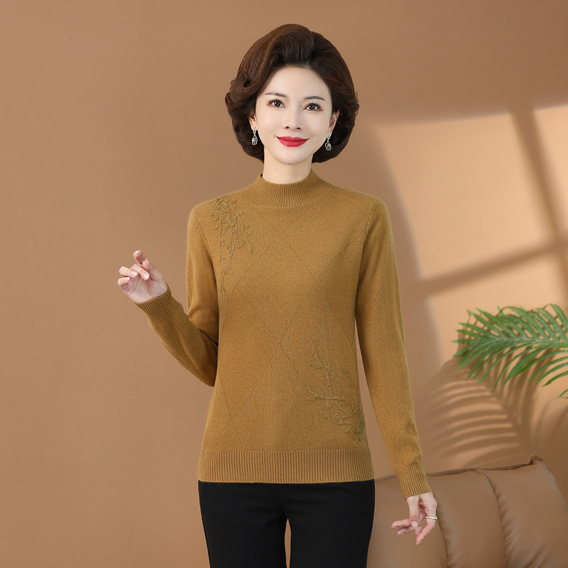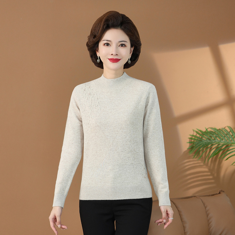 纯羊毛妈妈刺绣毛衣女2023新款秋冬装上衣50岁中老年保暖打底衫女