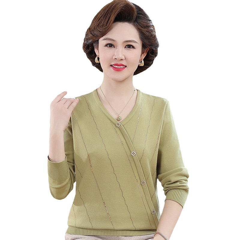 针织衫妈妈装秋季冰丝上衣V领针织毛衣上衣秋季新款V领烫钻打底衫