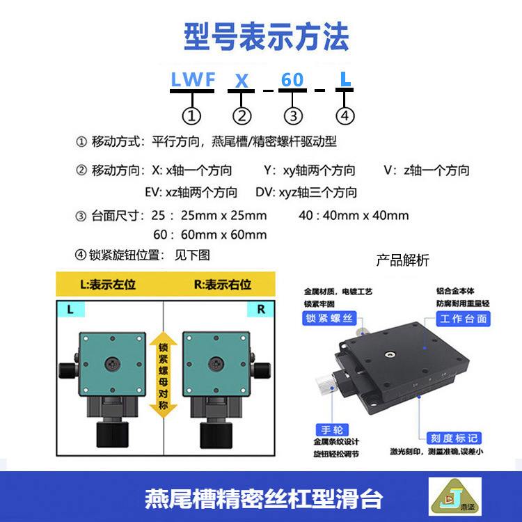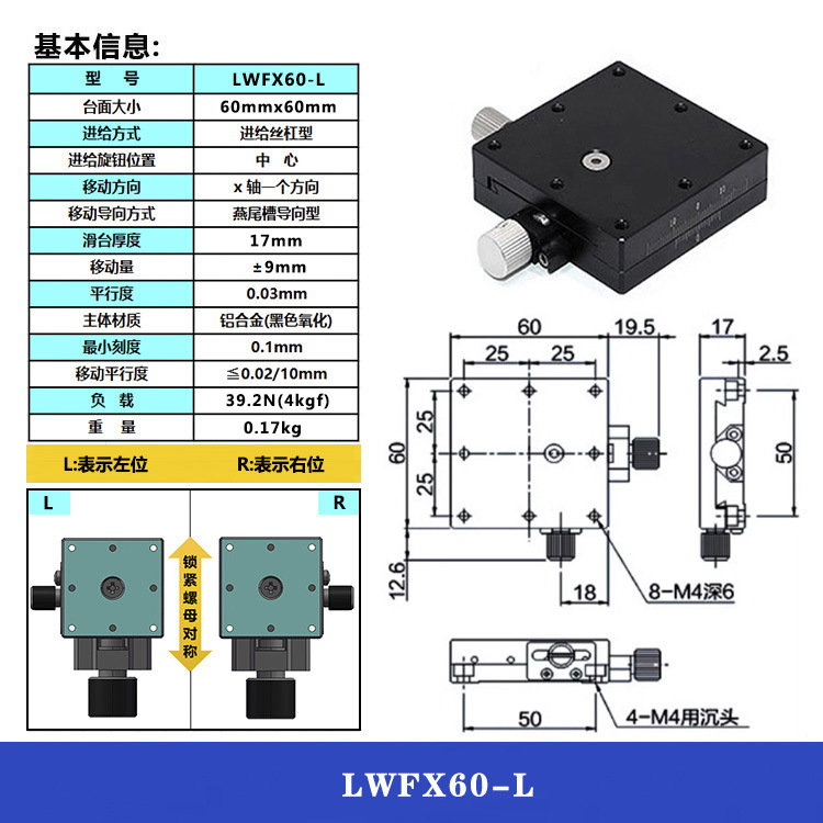x轴手动精密螺杆燕尾槽滑台lwfx60-l 进给丝杠型光学移动位移平台