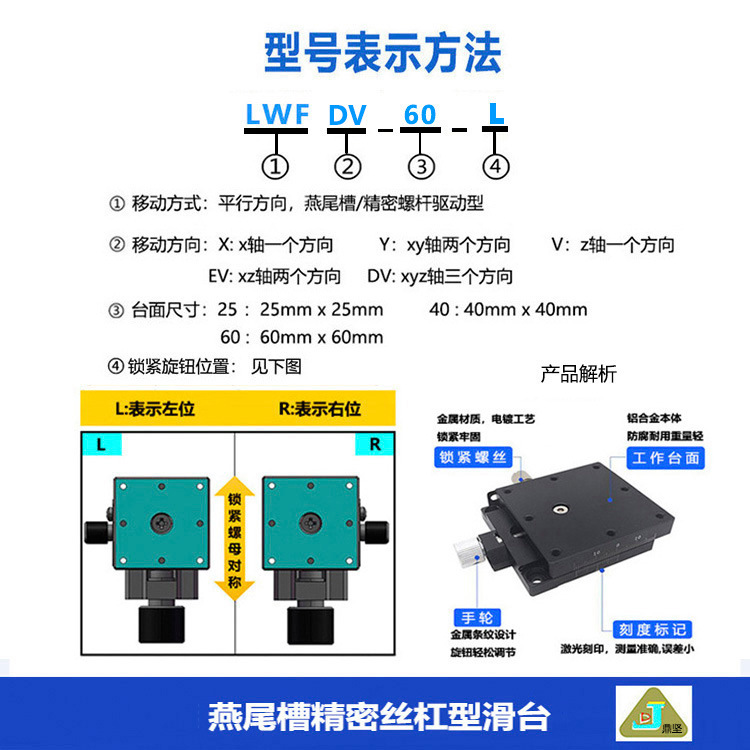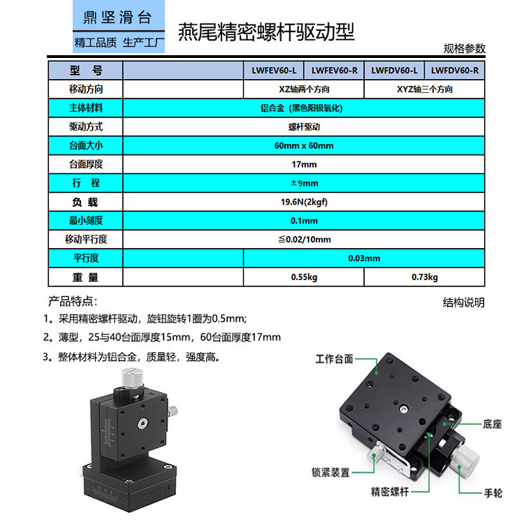 xyz燕尾槽移动平台lwfdv60三轴手动精密微调螺杆丝杠型燕尾槽滑台