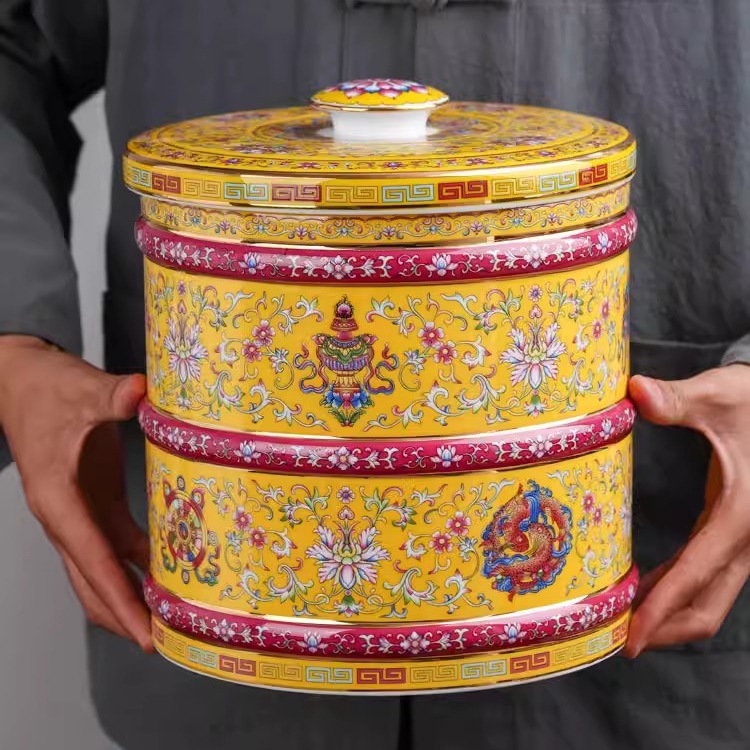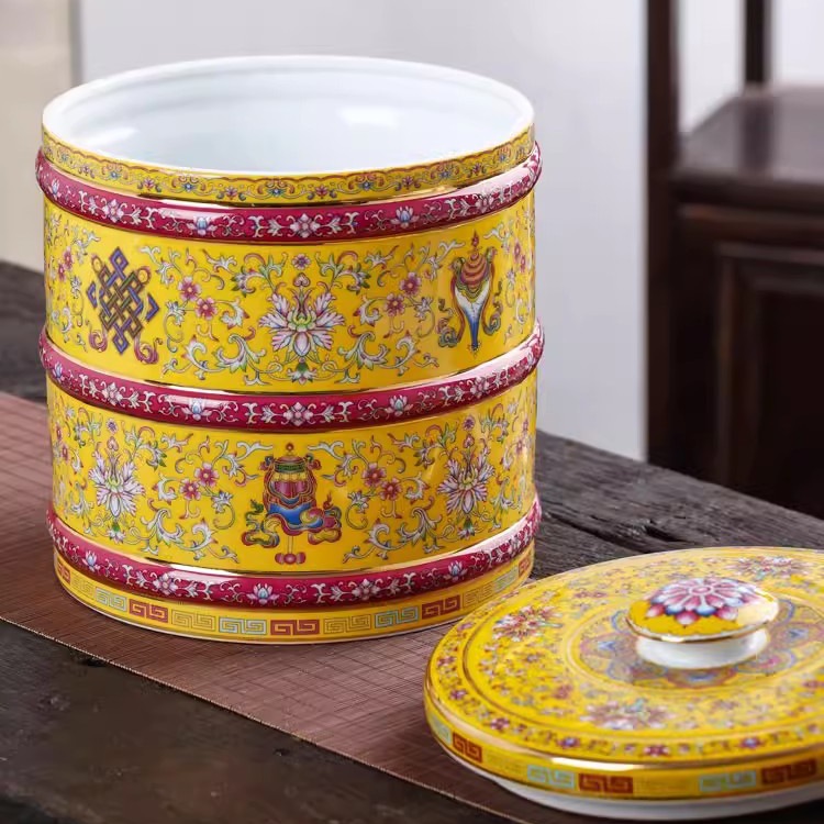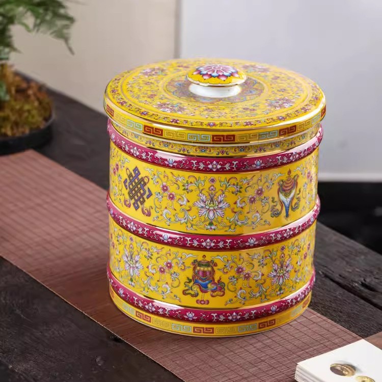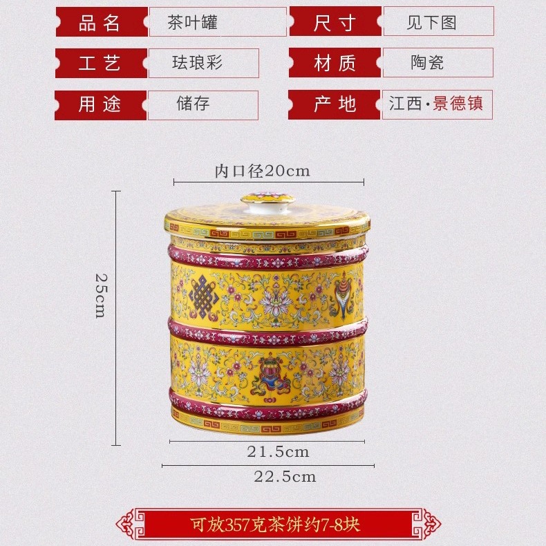 普洱七子饼存茶罐中式宫廷风珐琅彩八宝缠枝莲密封陶瓷茶叶罐礼物