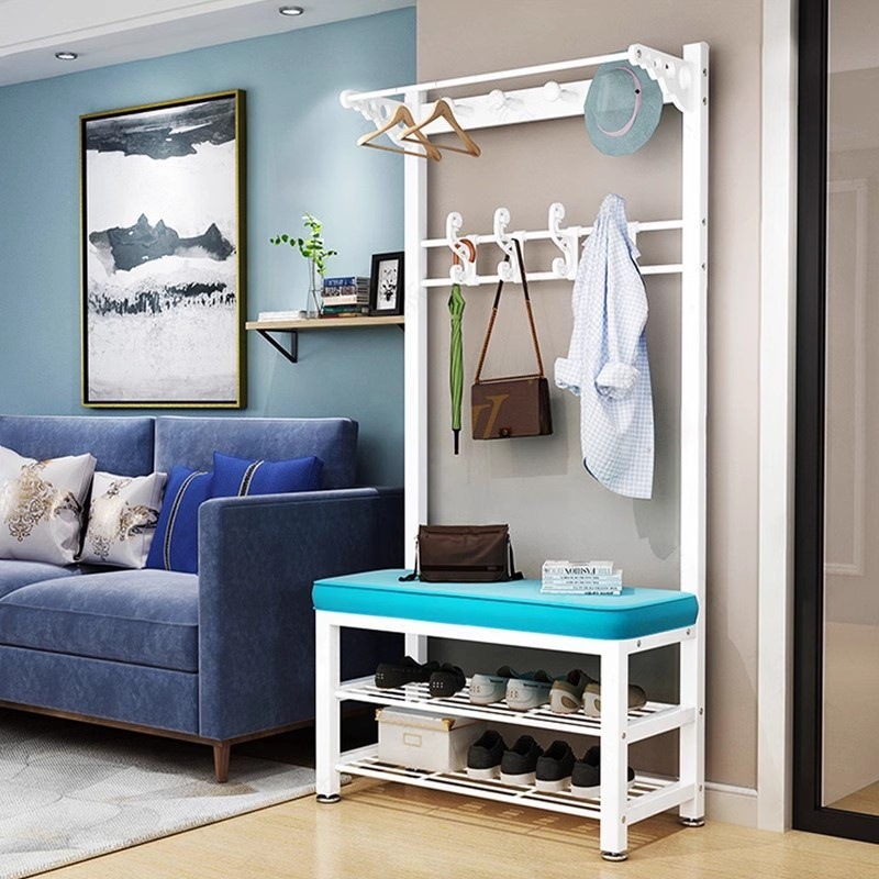 家用简易轻奢衣帽架玄关置物架落地立式衣架可坐软包多功能换鞋凳