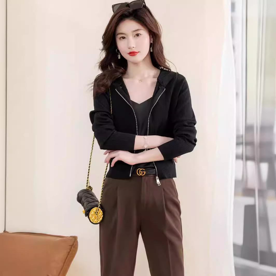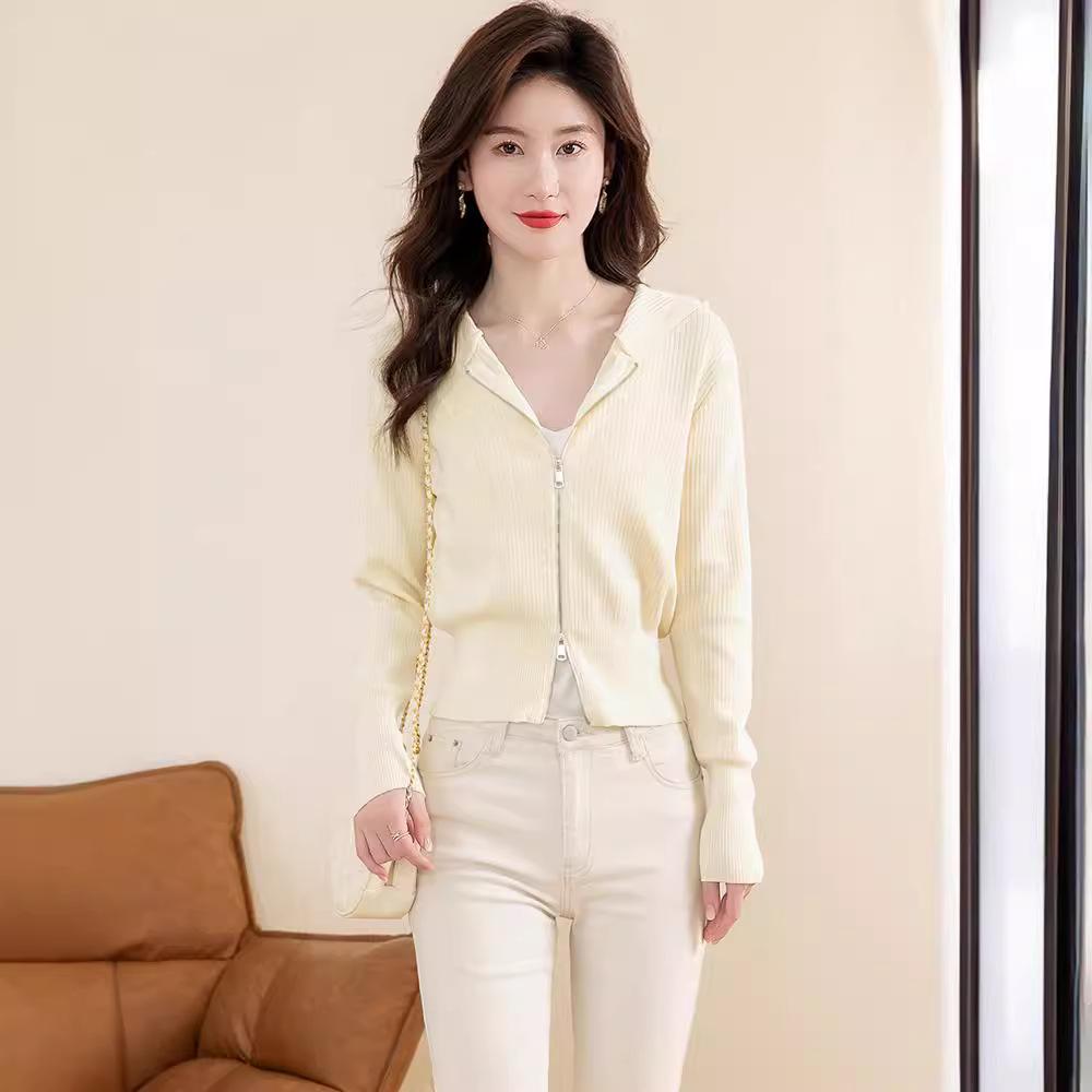 双拉链收腰设计感翻领针织开衫女春秋别致漂亮毛衣女外套正肩上衣