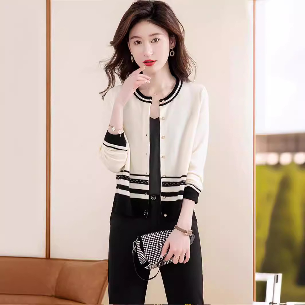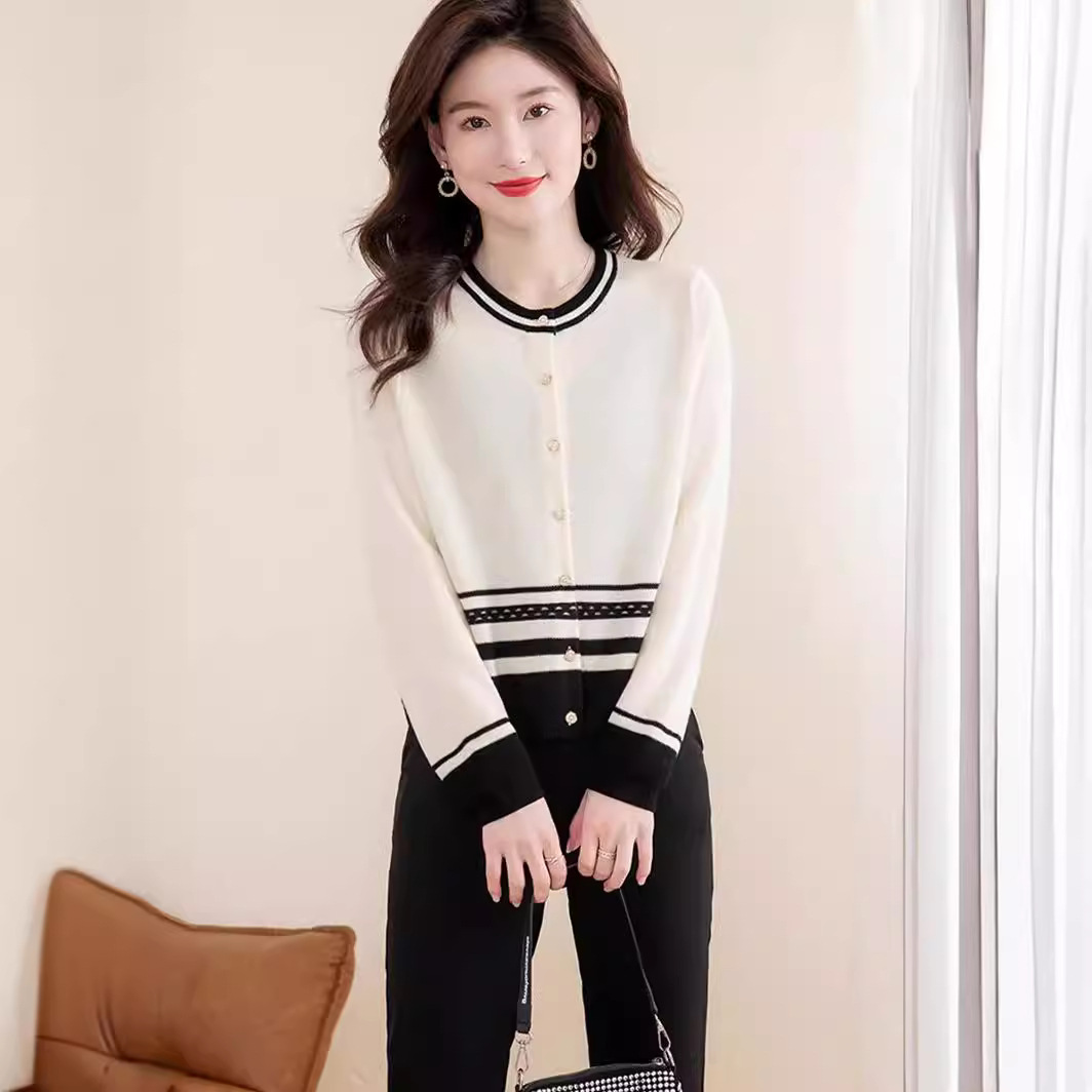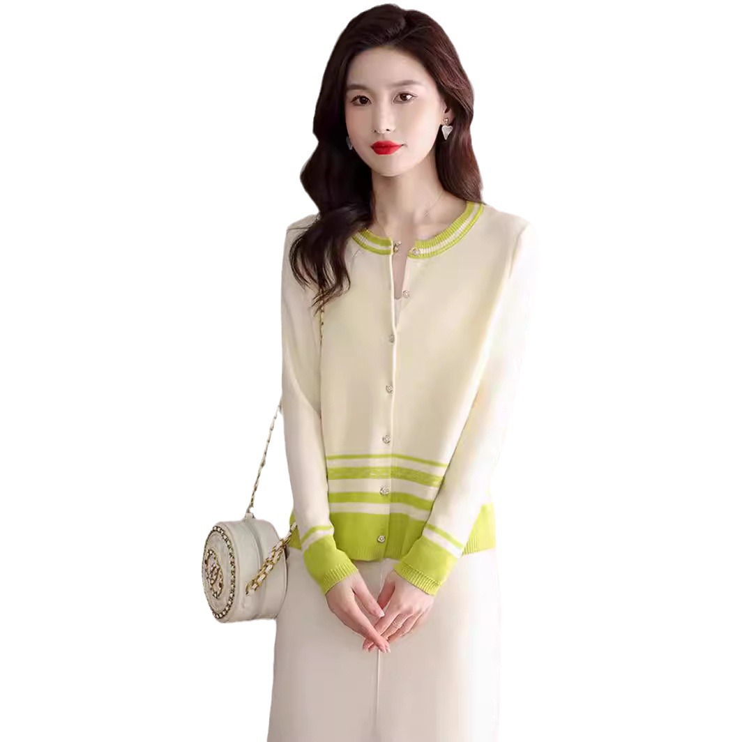 天丝毛衣夏季拼色外搭毛衣女装韩版开衫外套女针织打底衫圆领长袖