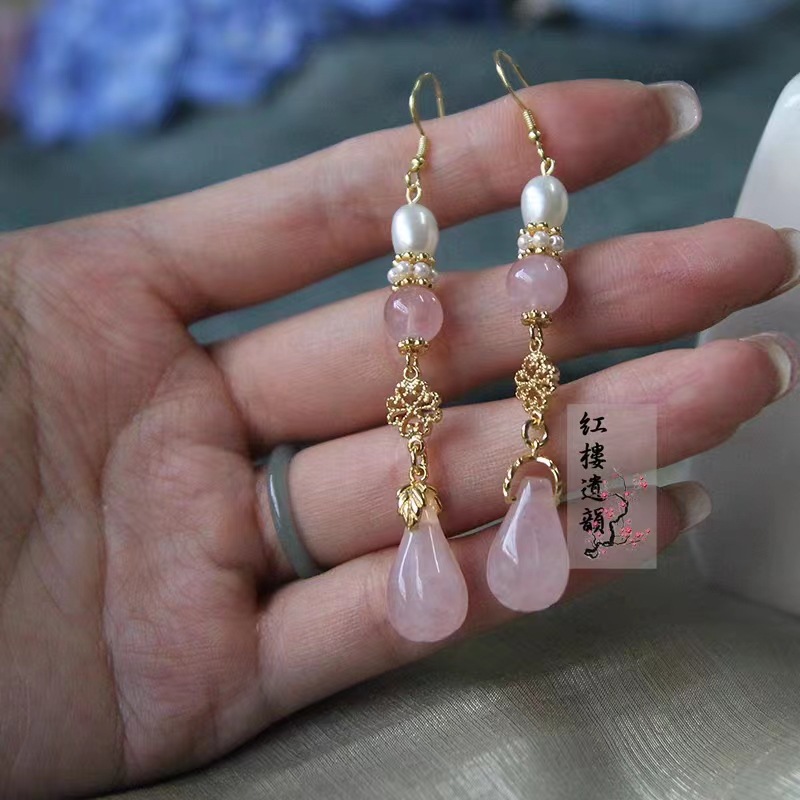 天然粉晶新中式玉兰花苞耳坠汉服古风旗袍耳饰复古气质耳夹耳钩女