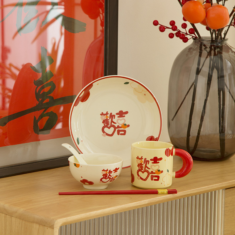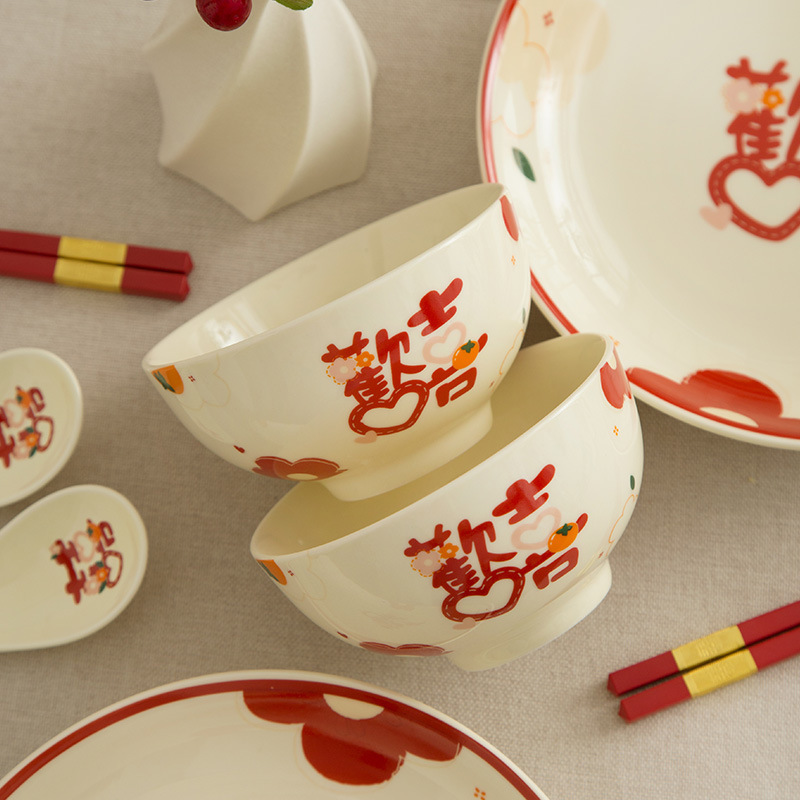 | 颜色 | 欢喜对杯+盖+勺(一箱20套起批) | 颜色 | 欢喜2碗2勺2筷2杯1盘(一箱12套起批) |