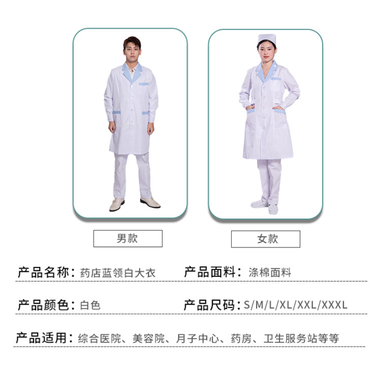 | 主面料成分2 | 涤纶(聚酯纤维) | 货号 | 药店蓝领白大衣 |