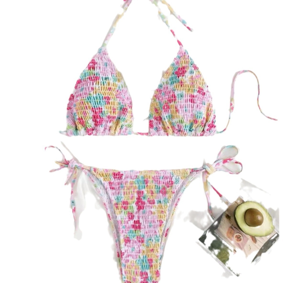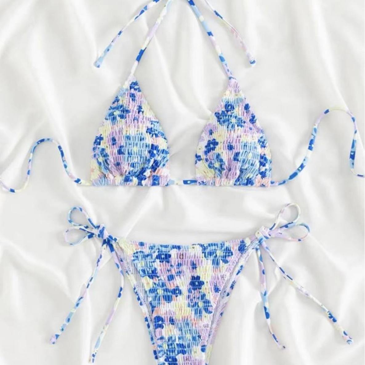 2025新款三角包泳衣女跨境性感三点式绑带小胸沙滩印花温泉比基尼