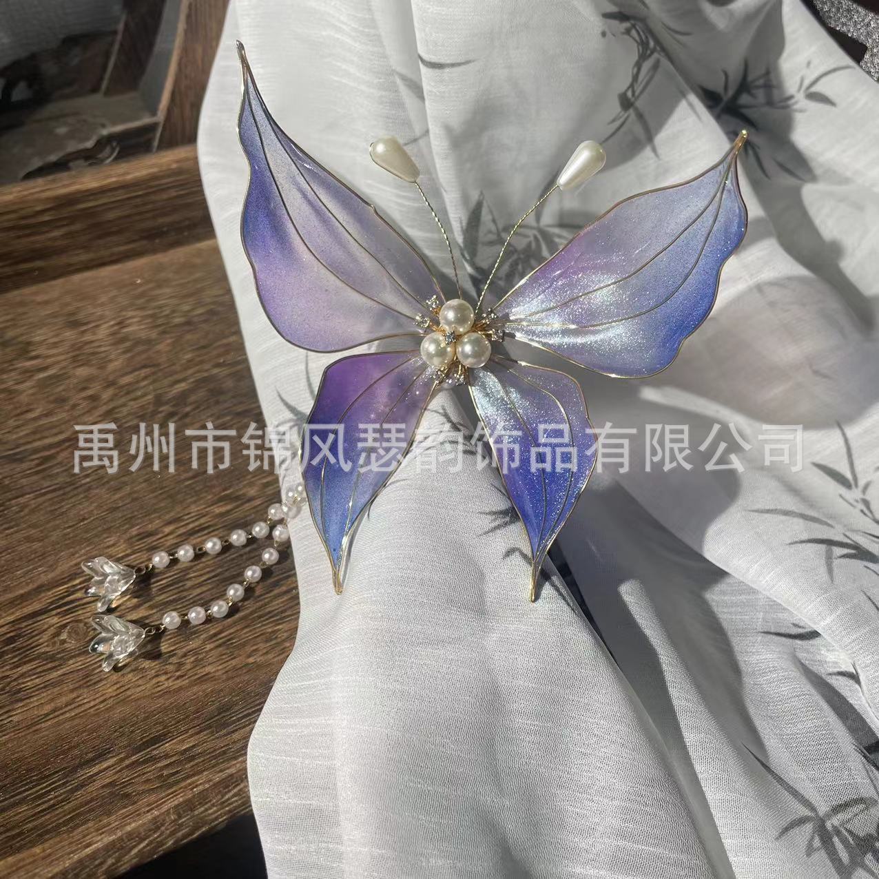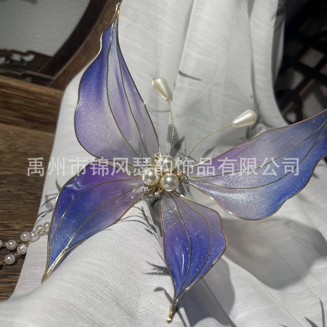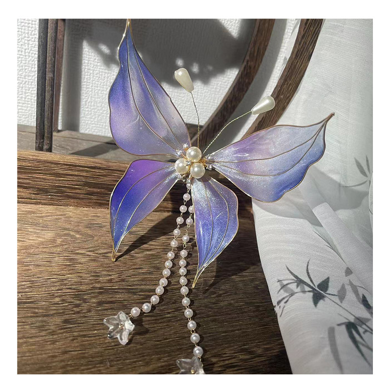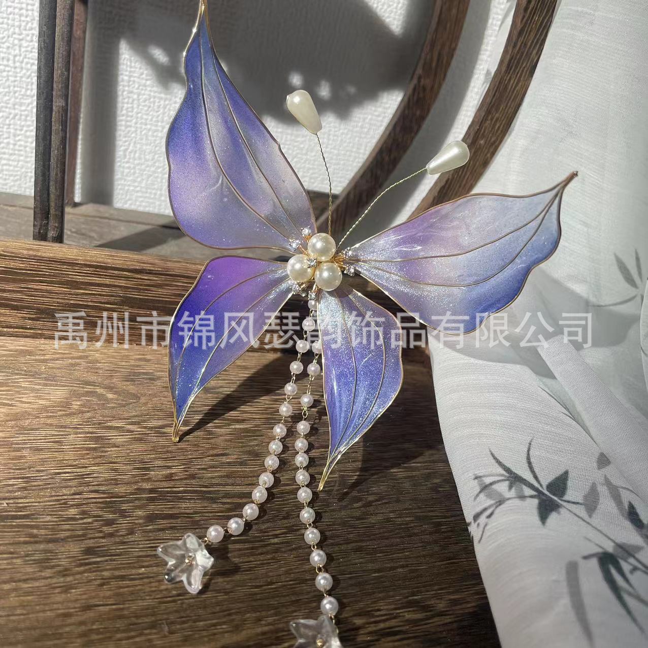造花液珠光蝴蝶灵气紫色轻薄流光古风小蝴蝶发钗汉服蝴蝶流苏小钗