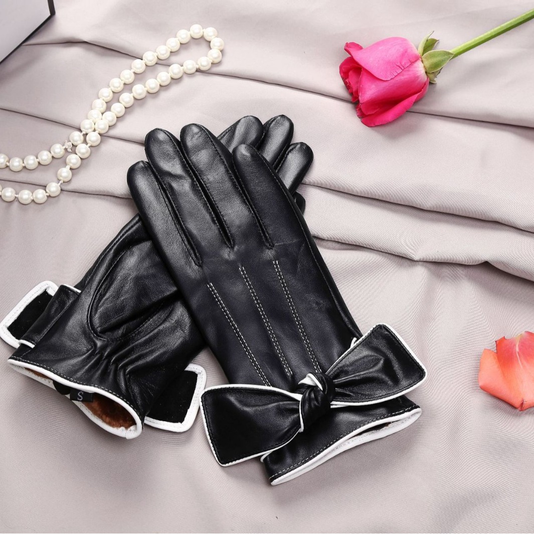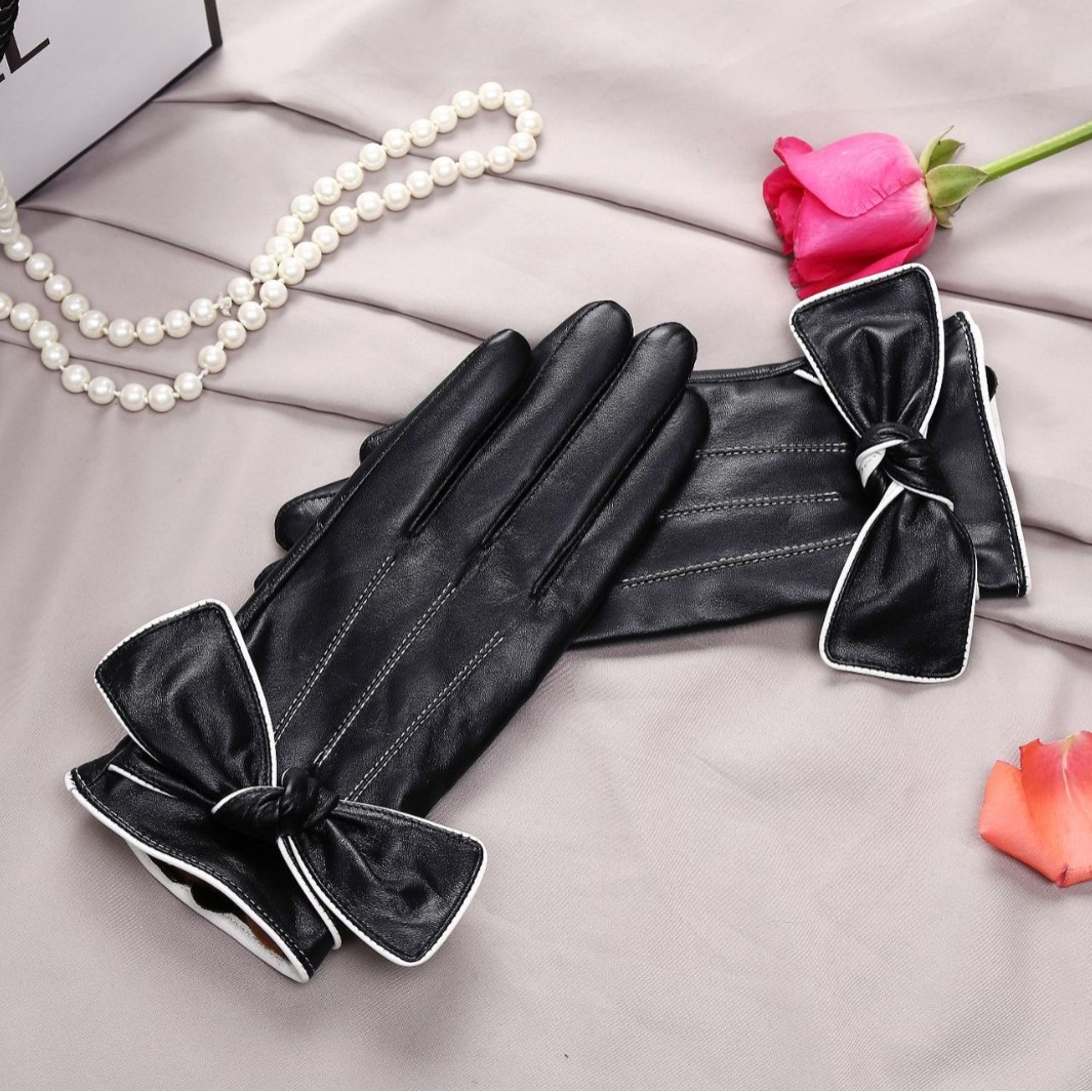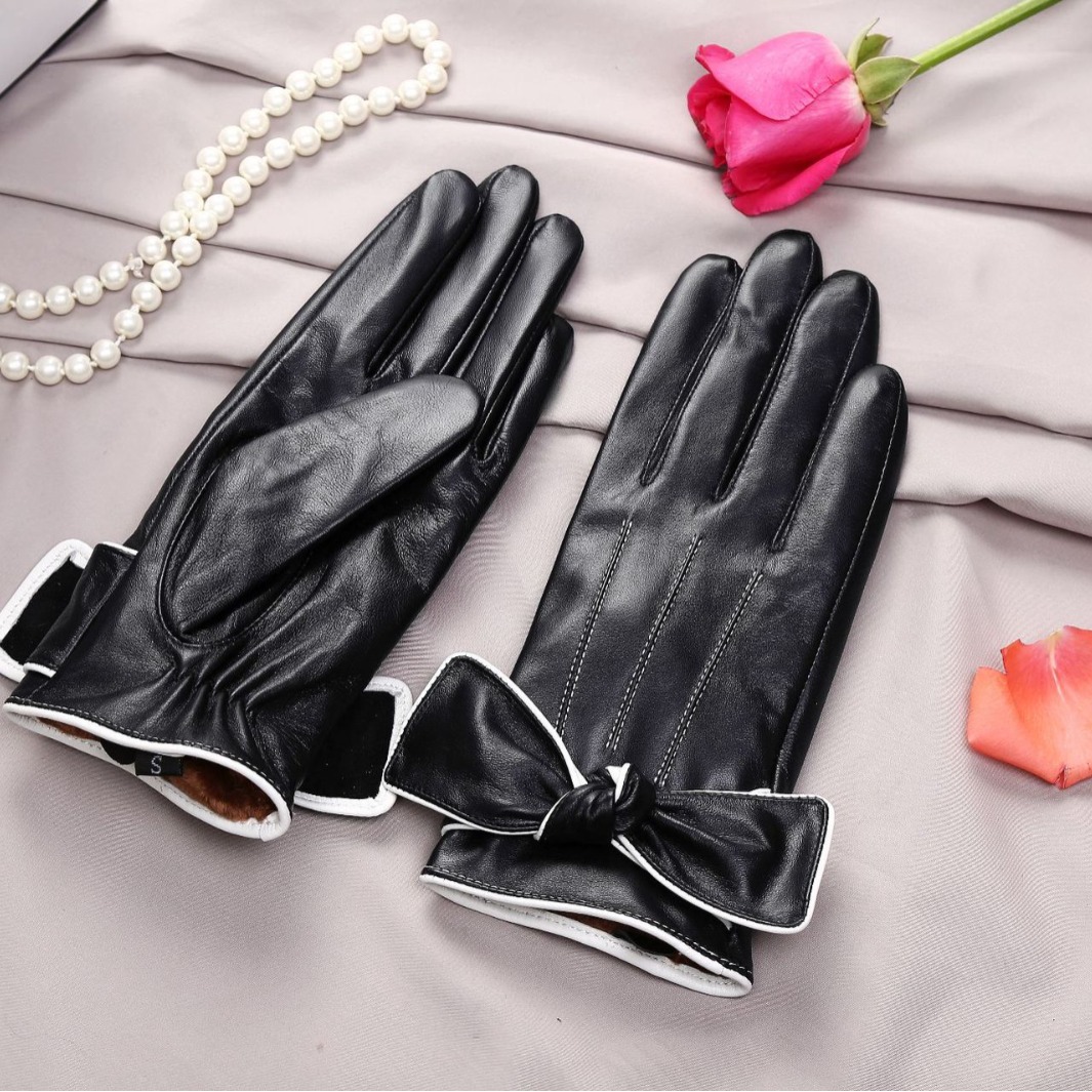 冬季女士羊皮手套触屏加绒保暖真皮手套蝴蝶结女士防寒情侣款