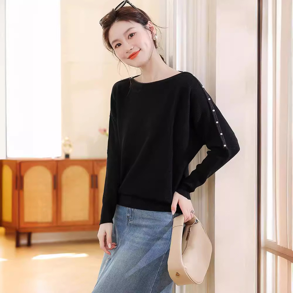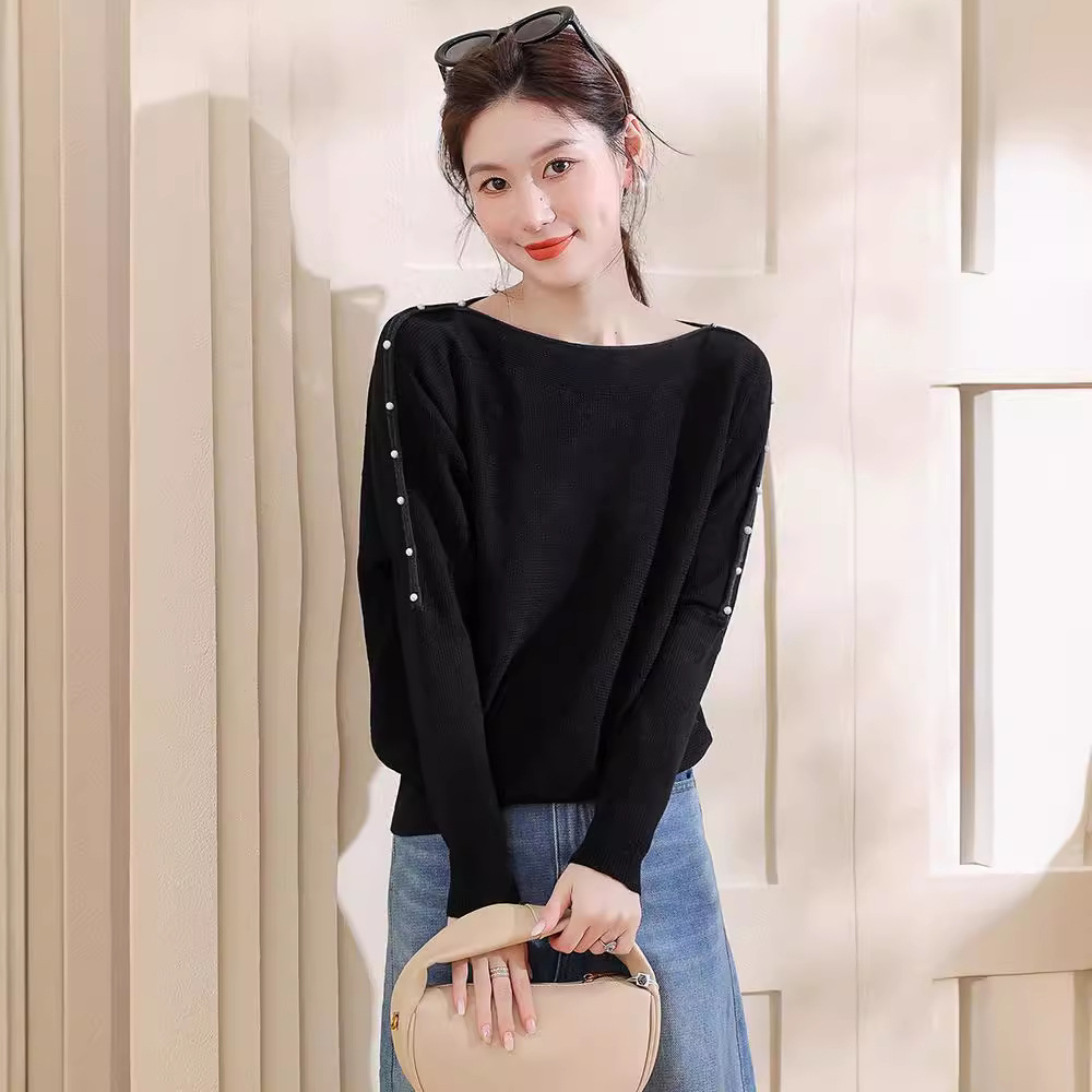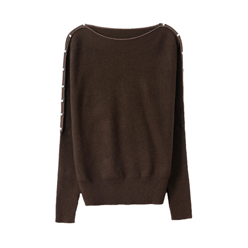6羊毛一字领打底衫女长袖钉珠针织上衣短款秋冬新款宽松套头毛衣