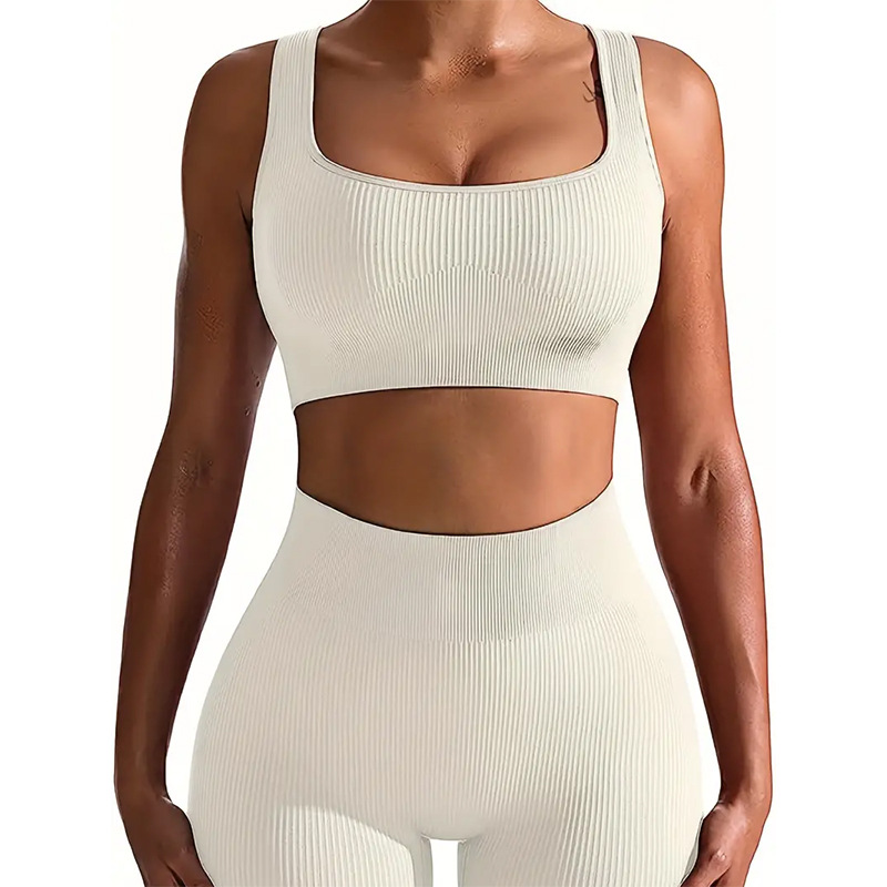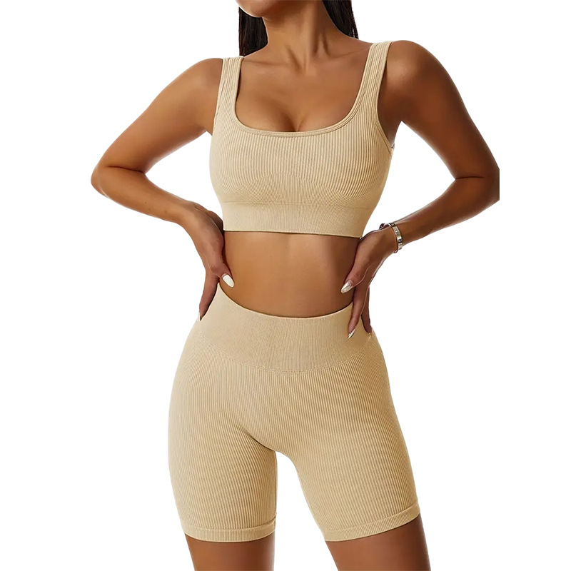 跨境欧美无缝罗纹纯色性感美背罗纹双背心三分短裤运动跑步健身