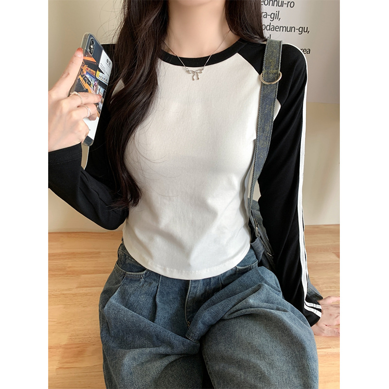 2024年新款秋季韩版2条杠条纹长袖t恤女撞色小众设计感修身上衣潮