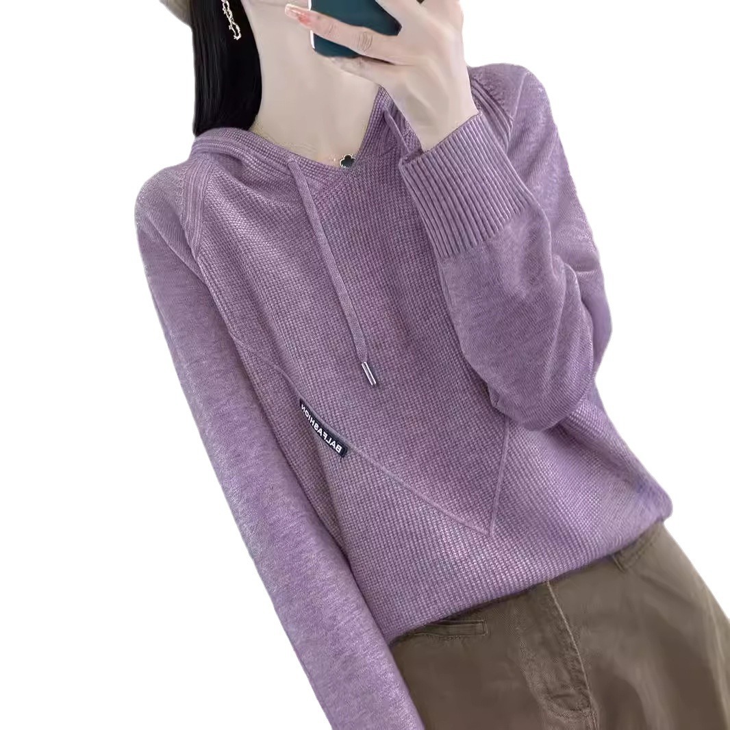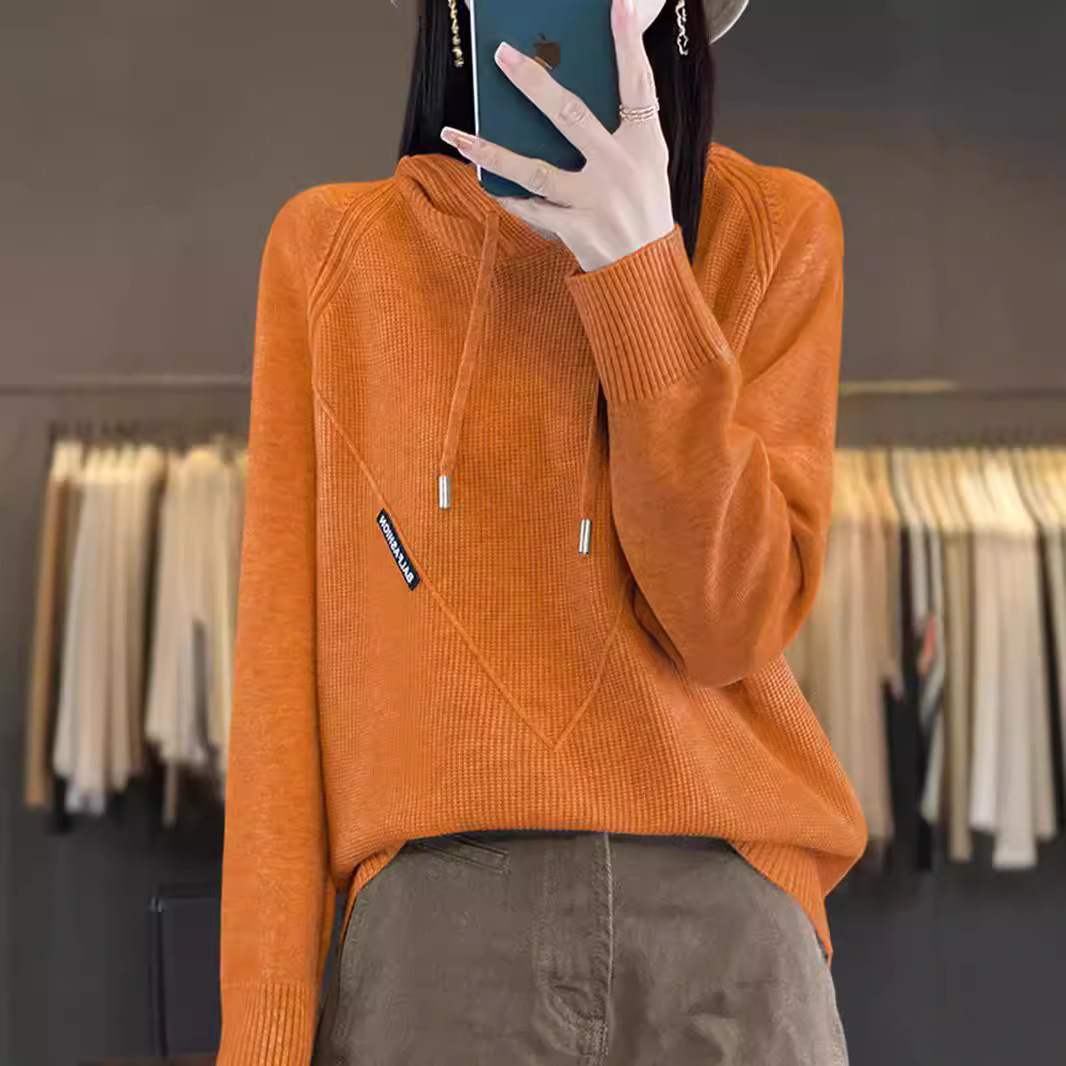 绒莱实拍2024秋冬韩版女装新款纯色连帽套头卫衣针织毛衣气质纯色