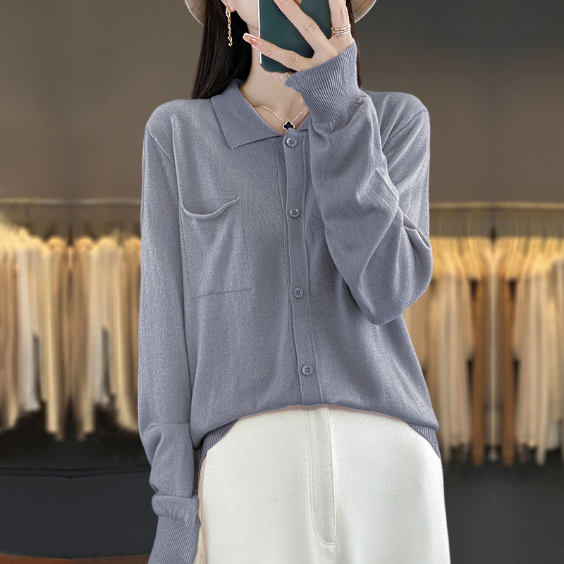 精纺包芯纱秋款衬衣女polo领针织开衫气质上衣设计感翻领薄款毛衣