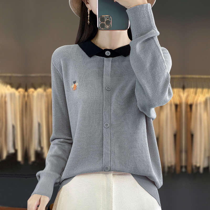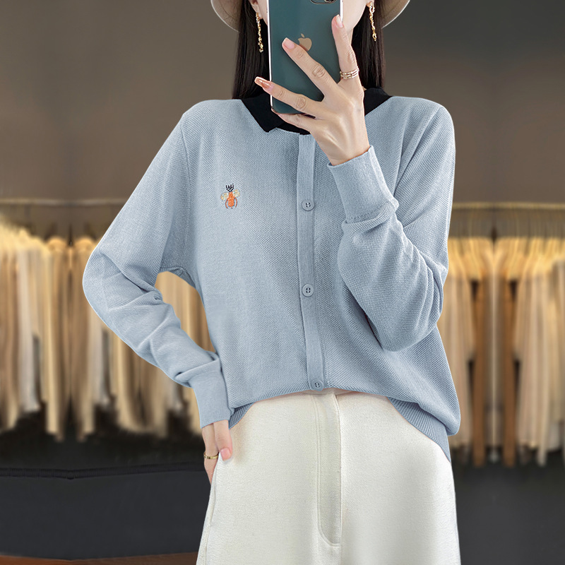 秋冬新款小蜜蜂长袖小翻领宽松显瘦设计感时尚百搭针织开衫上衣女